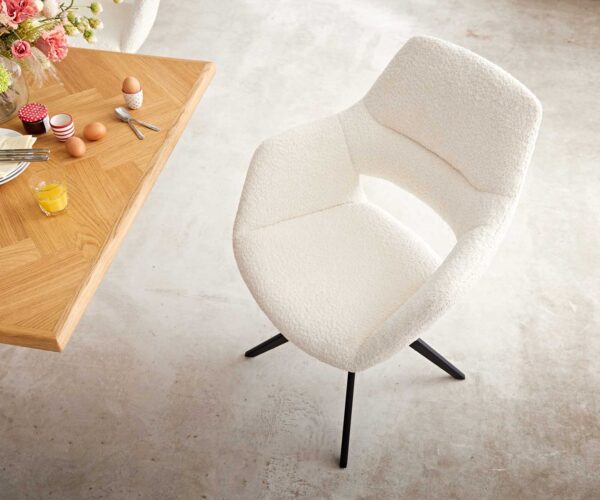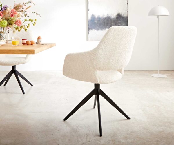Étkezőszék Yago-Flex XL karfás bouclé fehér kereszt láb széles fekete 360° forgatható