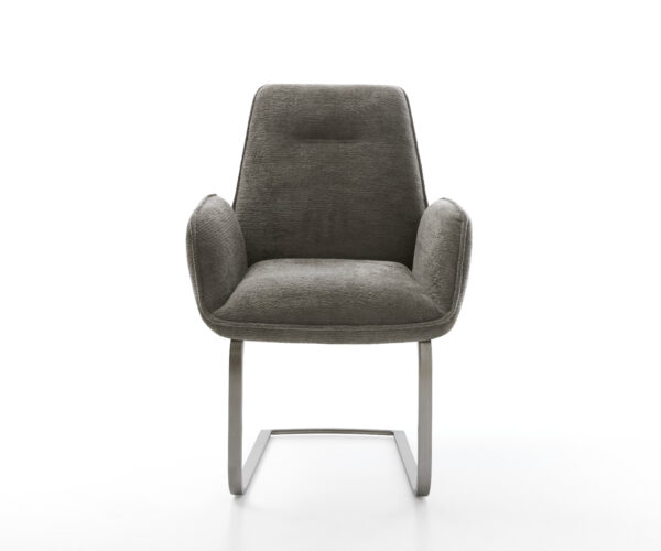 A Zoa étkezőszék ülőhéja kiváló minőségű kárpitozásával és szabadon álló, szintén kellemesen puha kárpitozású karfáival a legmagasabb ülési kényelmet ígéri. Gondosan kidolgozott részletek, mint az extravagáns dupla díszvarrás finom steppeléssel a háttámlán, illetve a klasszikus szegélyezés, különösen elegáns design-bútor darabbá teszik ezt a szék elemet.