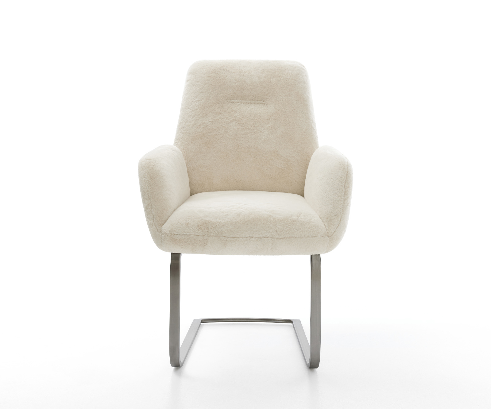 A nemes plüss huzat lágy krémfehér színben különösen elegáns kisugárzást kölcsönöz a széknek. A puha tapintás a legmagasabb ülési kényelmet nyújtja – tökéletes modern étkező- és nappali terekhez, magas minőségű berendezéssel.
