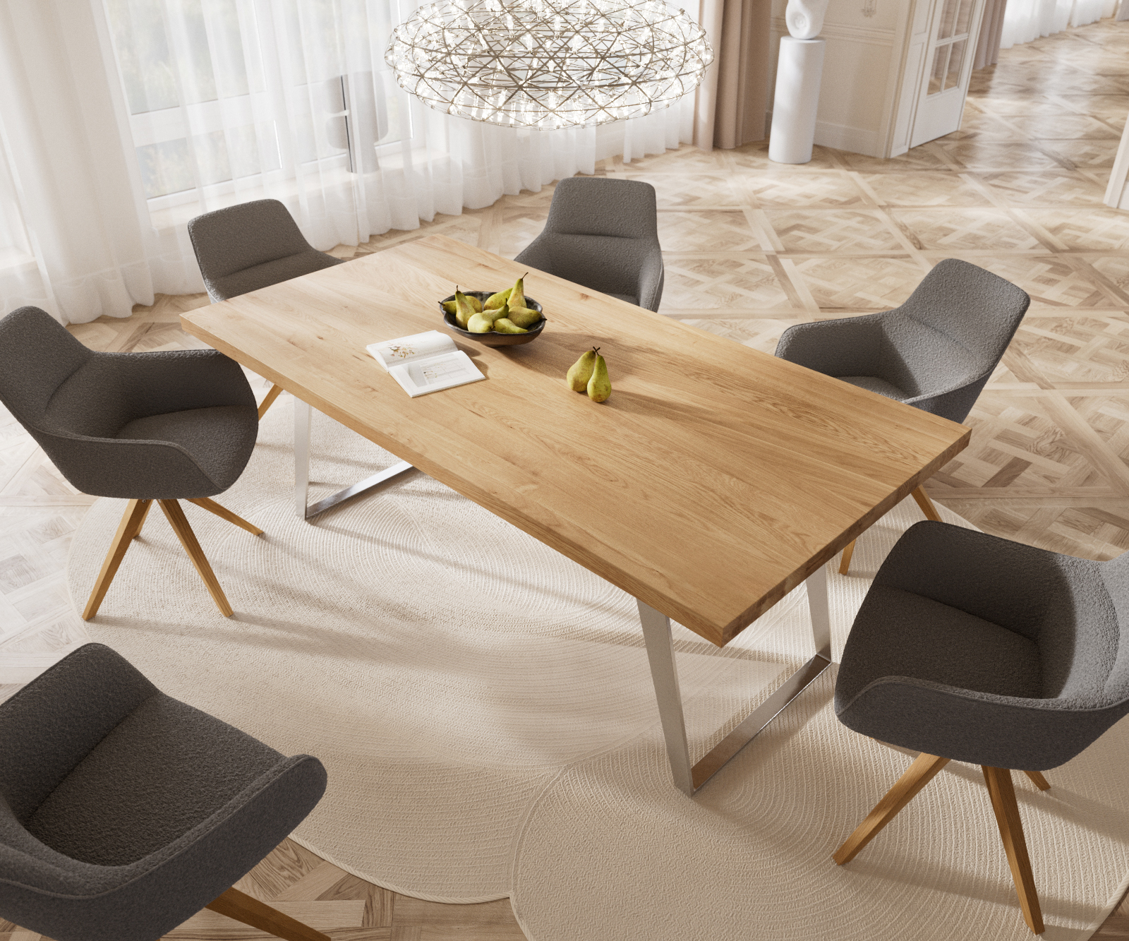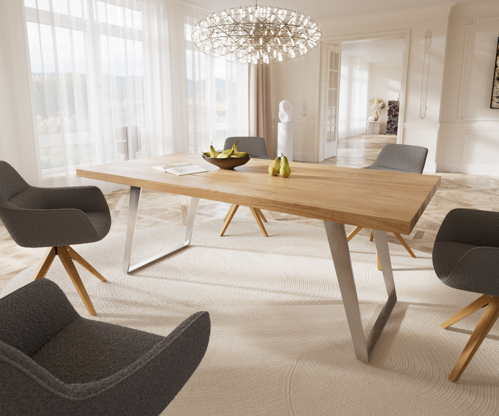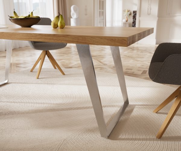 Šikmý skluzný rám z vysoce kvalitní nerezové oceli umně vytváří kulisu desce stolu a zároveň jí dodává vlastní živé akcenty. Kartáčovaná nerezová ocel je mimořádně odolná a nejlépe se hodí k dalším výtvorům z nerezové oceli.