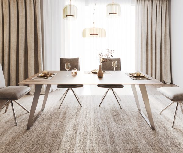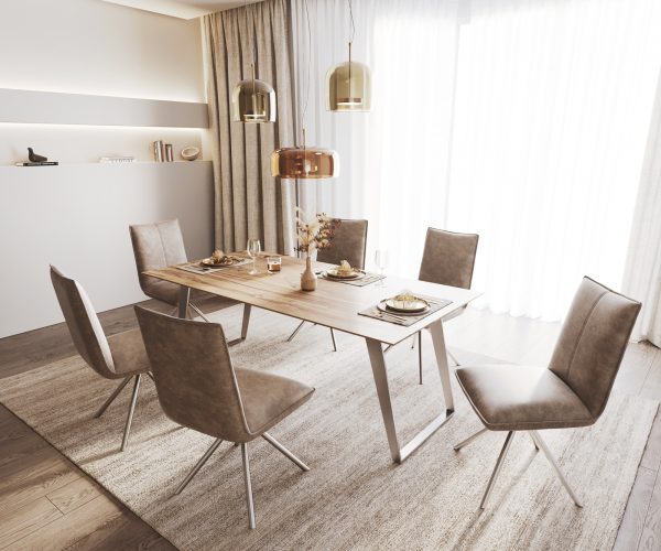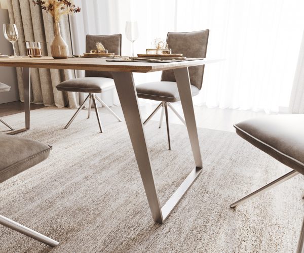 Šikmý skluzný rám z vysoce kvalitní nerezové oceli umně vytváří kulisu desce stolu a zároveň vytváří vlastní živé akcenty. Kartáčovaná nerezová ocel je mimořádně odolná a nejlépe se hodí k dalším výtvorům z nerezové oceli.