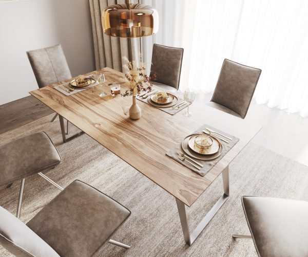 Jídelní stůl Edge 200×100 sheesham přírodní nerezová ocel šikmá podnož švýcarská hrana