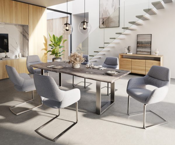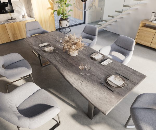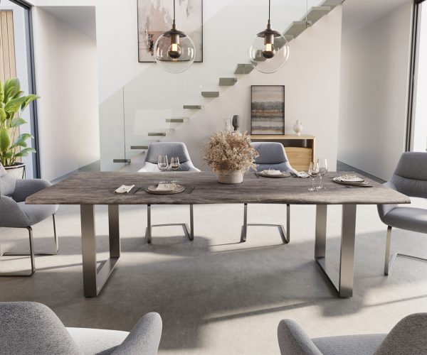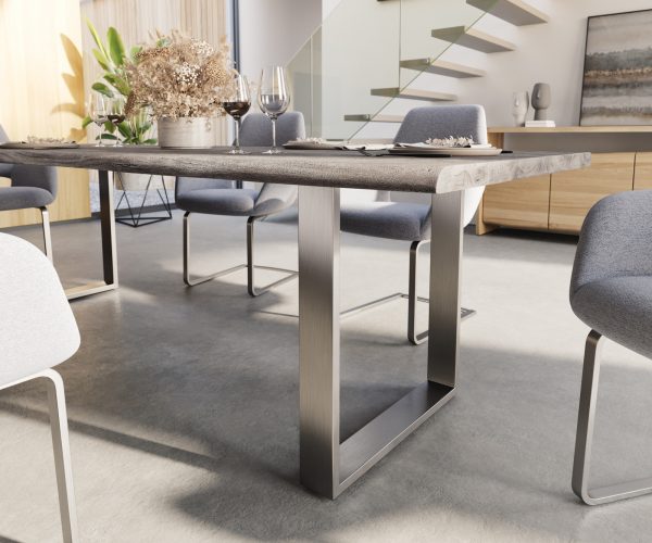 Live-Edge se stromovými hranami v platinové barvě – ideální pro vaši jídelnu