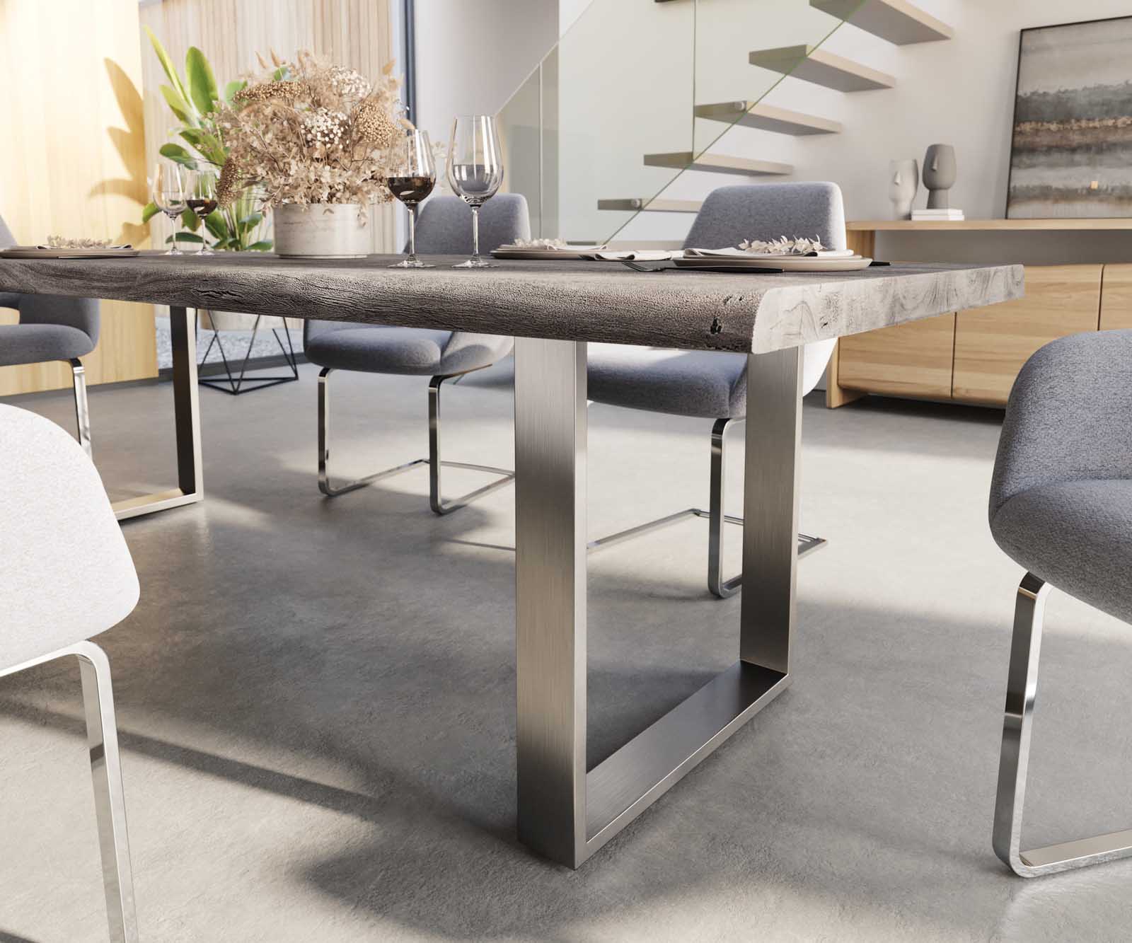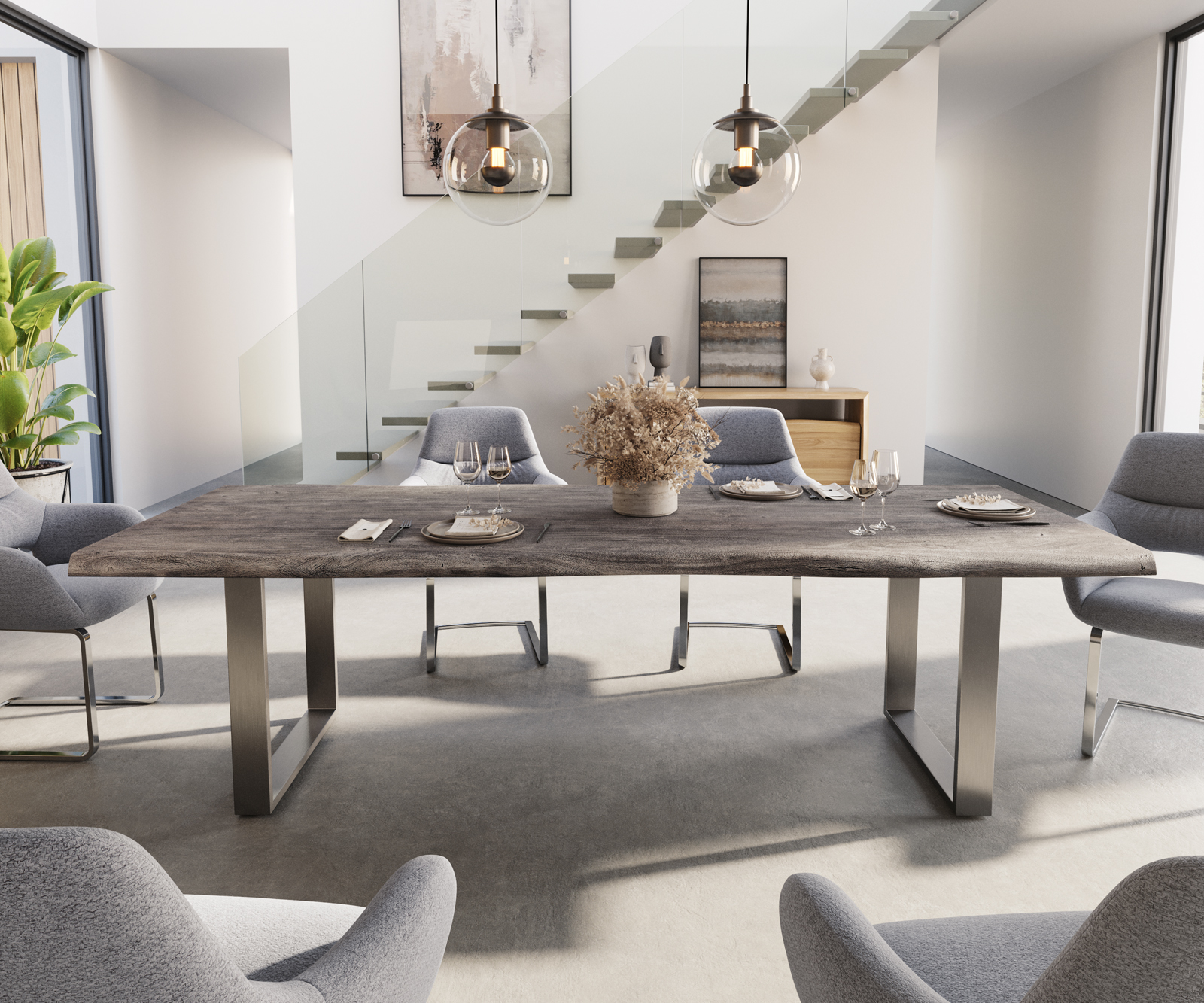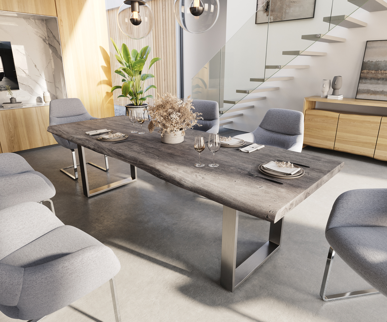 Live-Edge se stromovými hranami v platinové barvě – ideální pro vaši jídelnu