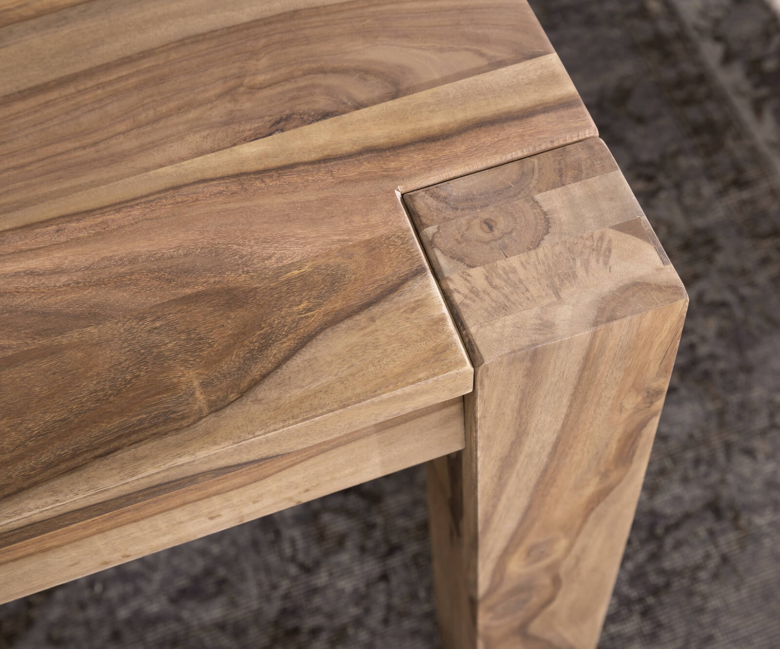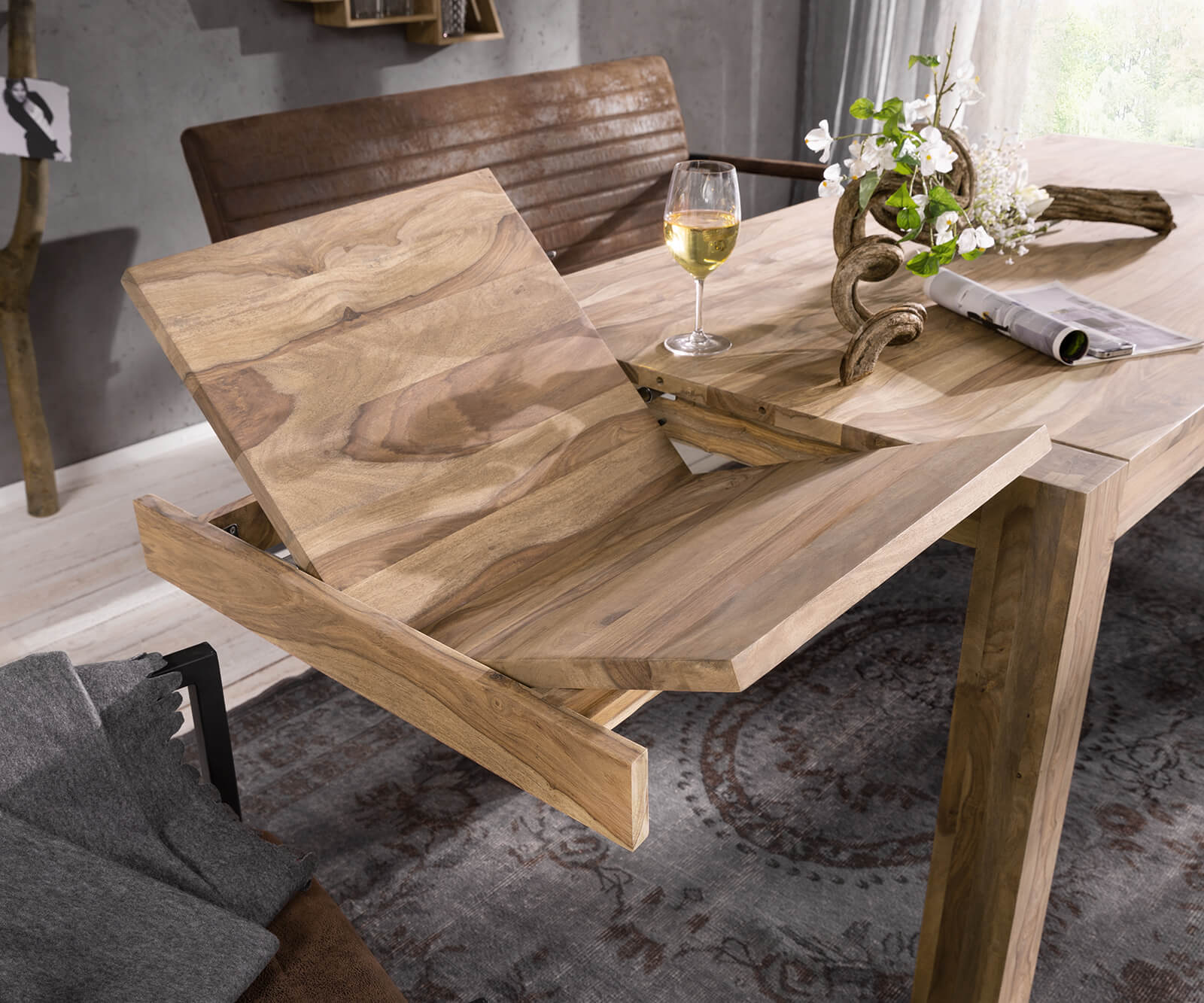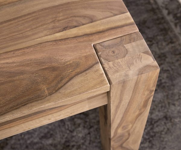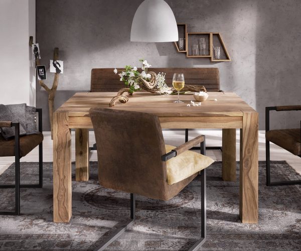 Série z masivního dřeva se vyznačuje výraznou kresbou sheeshamu a čistým designem. Ať už jde o odkládací stolky, komody nebo postele v různých provedeních – všechny jednotlivé kusy z této série jsou precizně sladěné a lze je optimálně kombinovat. Pokud jste společenský člověk, který rád zve přátele a rodinu, pak často vyvstává otázka – kam všechny ty lidi umístit. Zvláště u stolu se všichni sejdou a mohou si vyměňovat názory. U tohoto jídelního stolu ze sheeshamu můžete usadit přibližně deset osob. Zároveň se nemusíte obejít bez stylu a útulnosti. K tomuto jídelnímu stolu nepotřebujete ubrus, protože charakteristická kresba dřeva je dostatečně dekorativní.