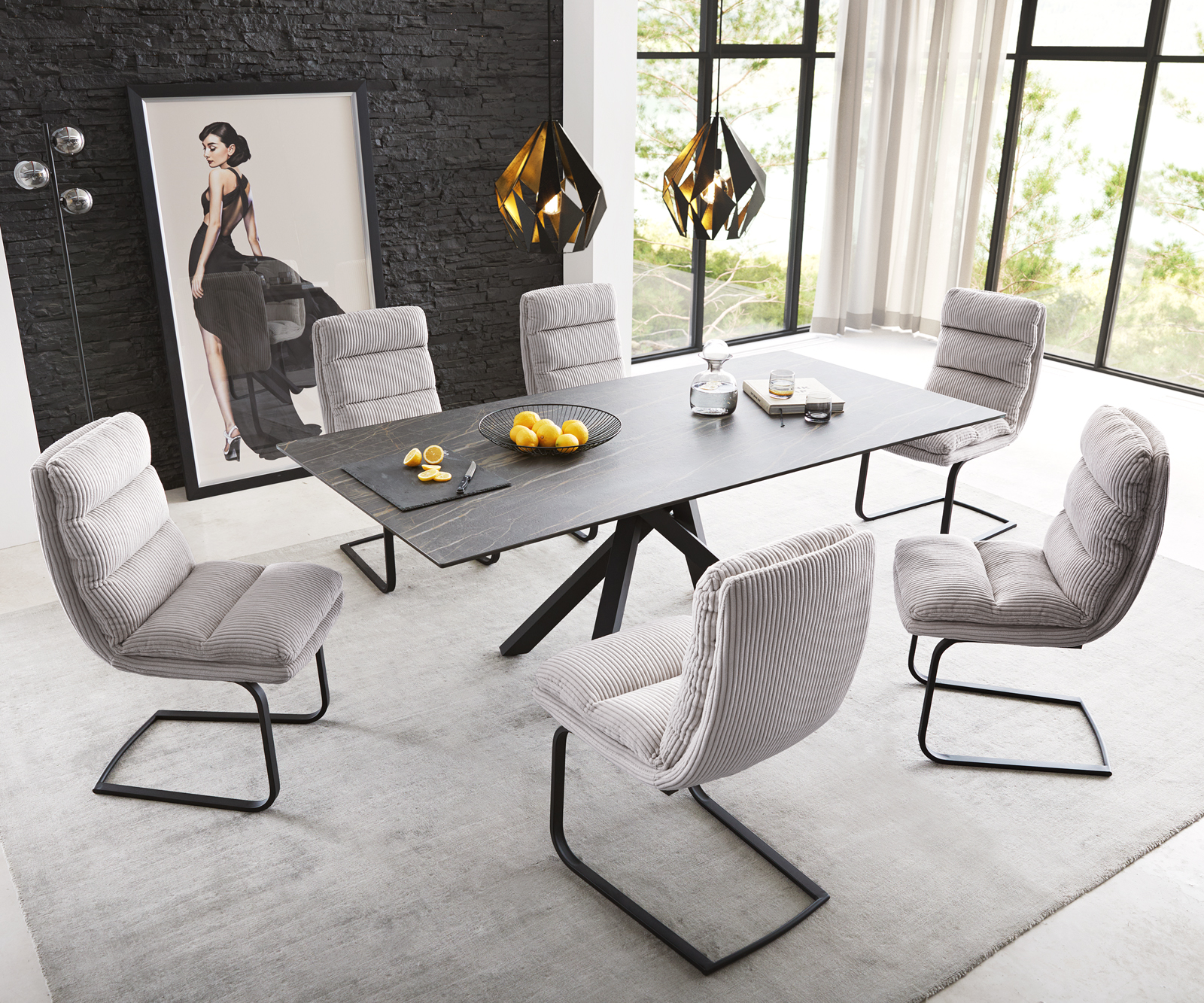Použitá manšestrová tkanina je obzvláště módní a vyznačuje se přitažlivým omakem, snadnou údržbou a ušlechtilou stříbrošedou barvou.