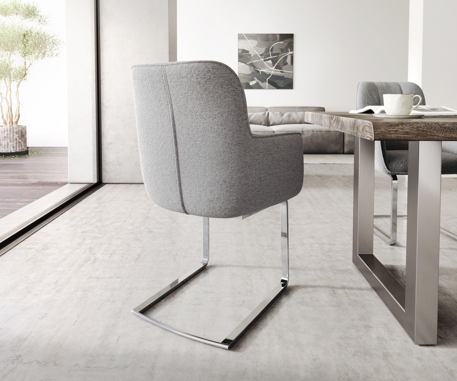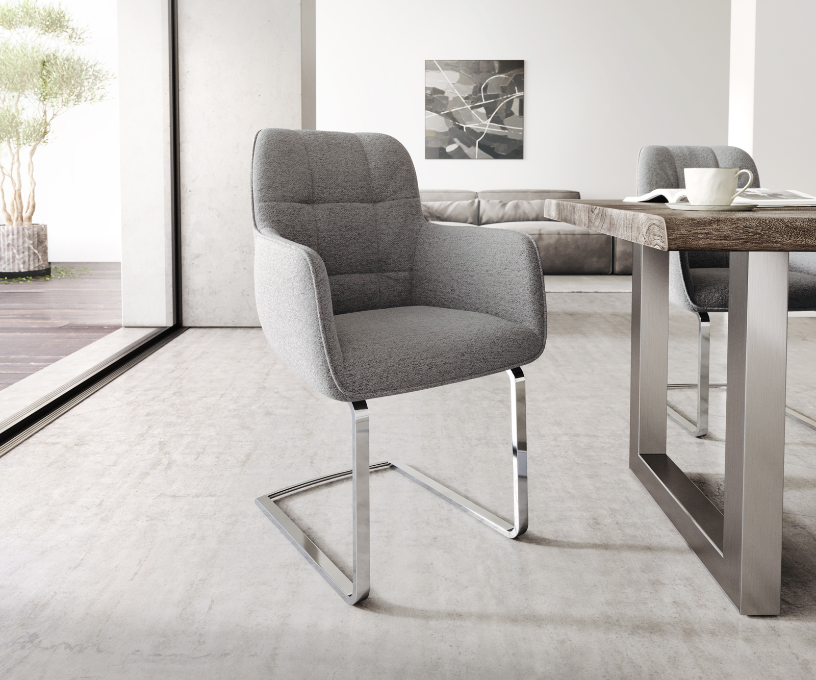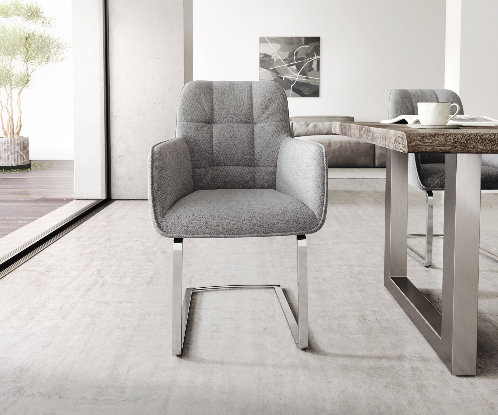 Jídelní židle Juno s područkami ve světle šedé texturované látce – systém židlí DELIFE
