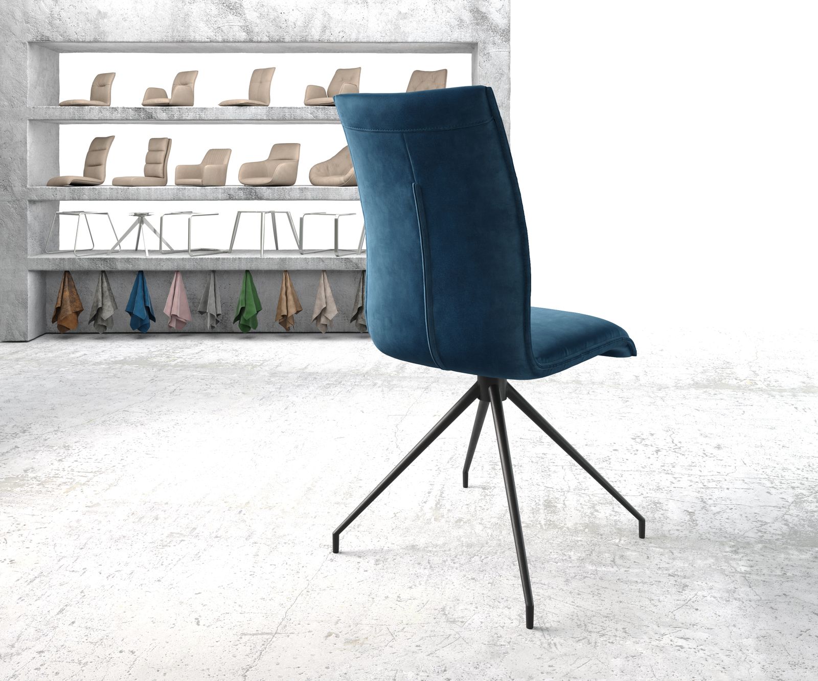 Sametová modrá jídelní židle Xantus – systém židlí DELIFE