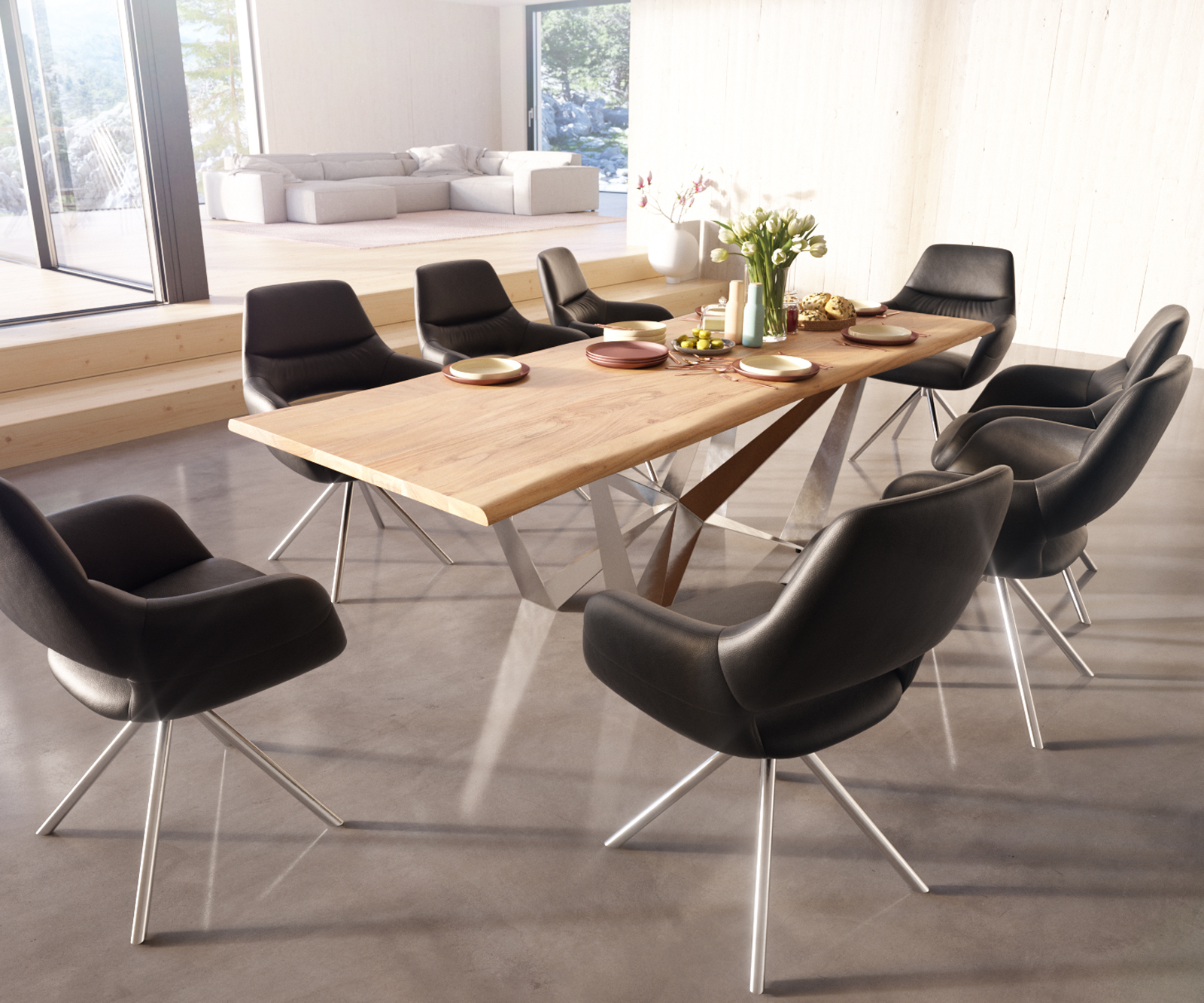 Moderní křížový rám působí příjemně harmonicky díky čtyřem kulatým nohám, které zajišťují mimořádně bezpečné postavení. Rám s funkcí vrácení lze otočit až o 180 stupňů. Díky této praktické funkci už nikdy neztratíte hosta u stolu z dohledu.