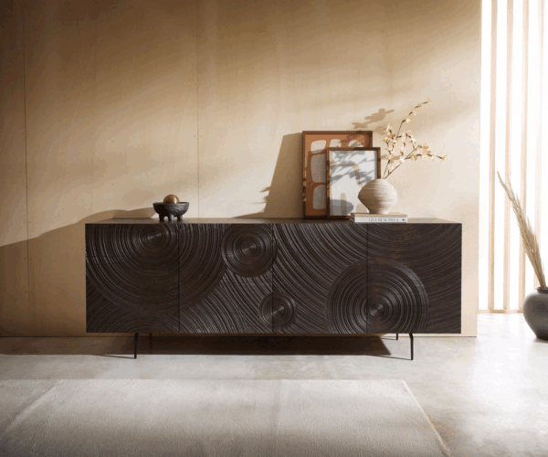 Sötét gesztenyefa felületével és feltűnő, kerek 3D marásokkal a Ashara komód stílusos hangsúlyokat teremt. Négy tágas ajtó kényelmes tárolóhelyet kínál, és kiváló minőségű vasalattechnikával nyűgöz le.