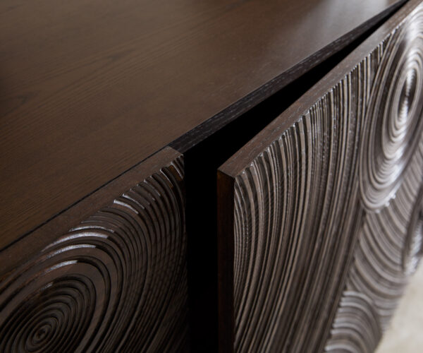 Az Ashara komód elegáns, sötétbarna kőrisfából készült, különleges, kerek 3D marásokkal díszített, amelyek stílusos hangsúlyt adnak az otthonodnak. Négy ajtó tágas és kényelmesen használható tárolóhelyet biztosít.