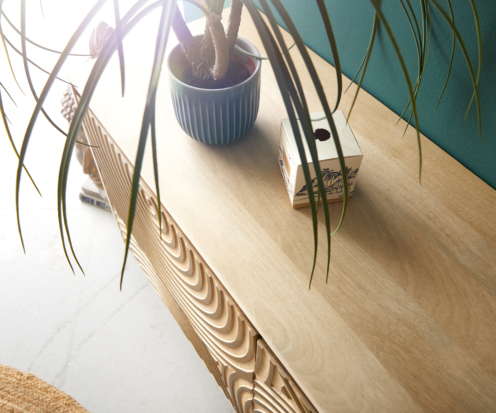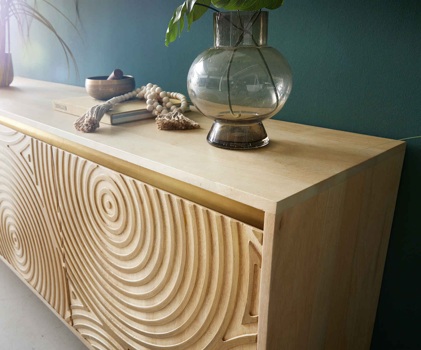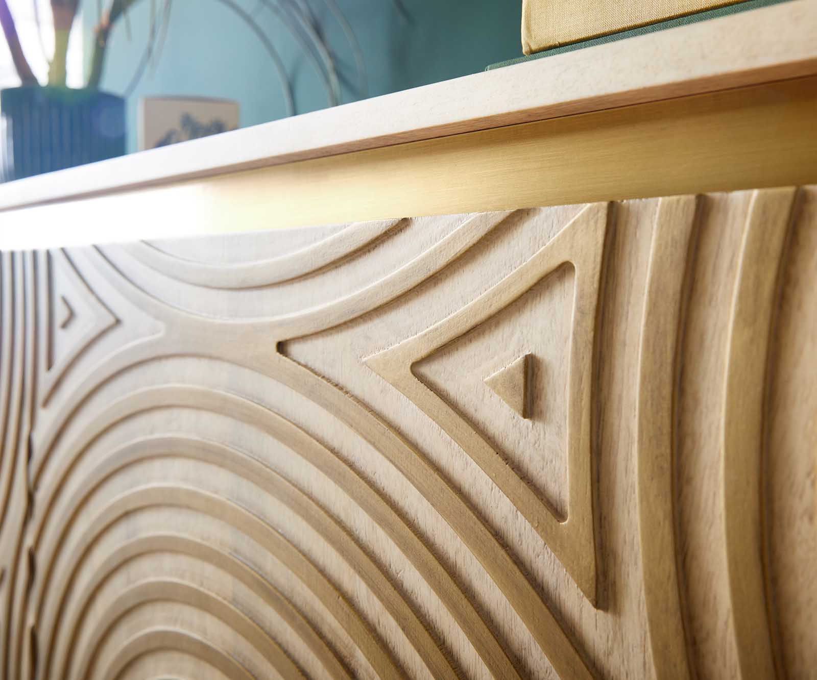 Tágas komód stílusos rendhez a nappaliban. A sárgaréz díszítés mintázata különleges és trendi etno stílusú megjelenést kölcsönöz. Természetes világos középbarna mangó színben, enyhe szürkés-sárgás árnyalatokkal.