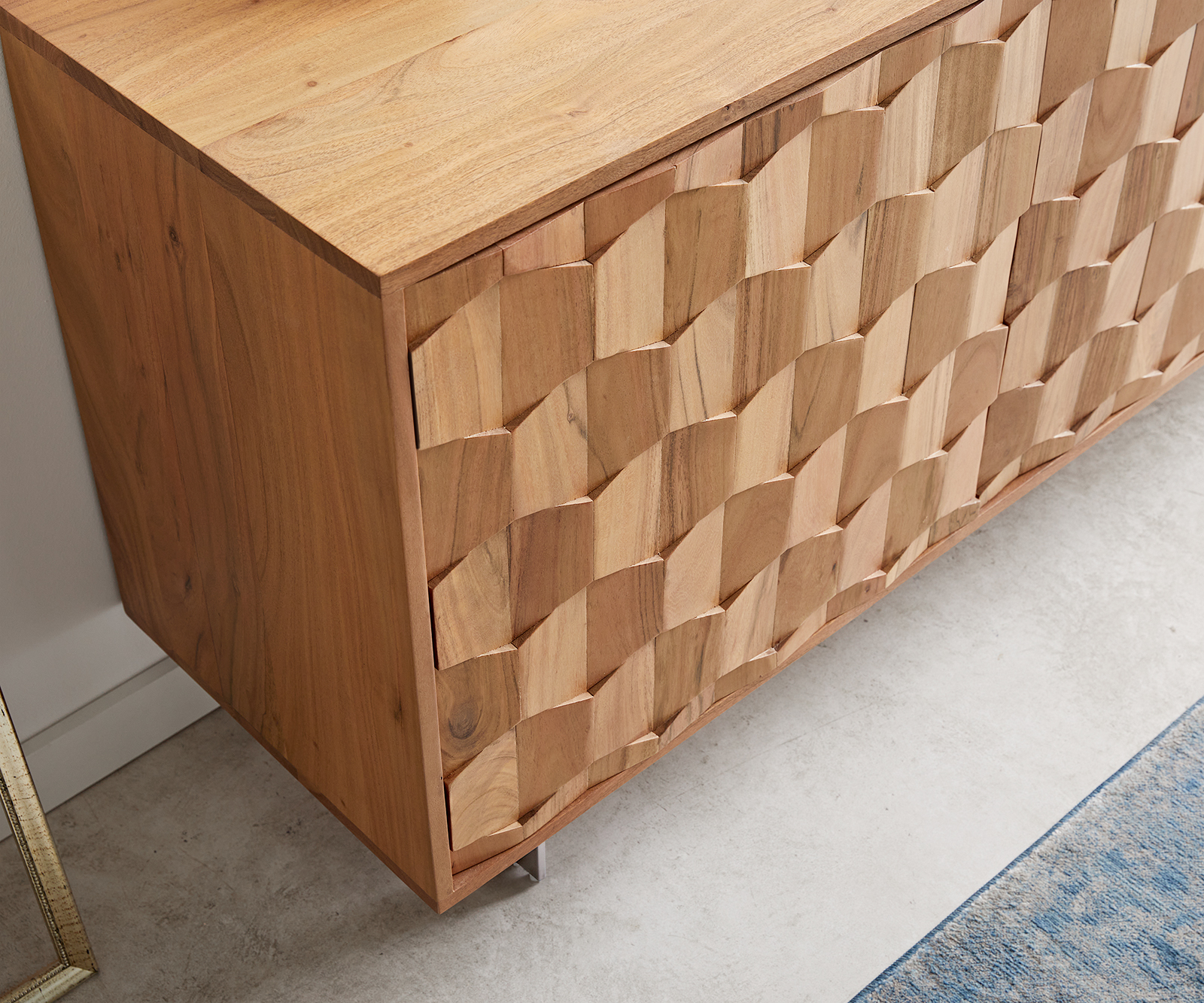 A természetes akácfa meleg árnyalatban ragyog, és egyedi erezetével tűnik ki. A stílusos komód 2 praktikus ajtó és 3 fiók mögött rendezett tárolóhelyet biztosít 175 cm szélességben.