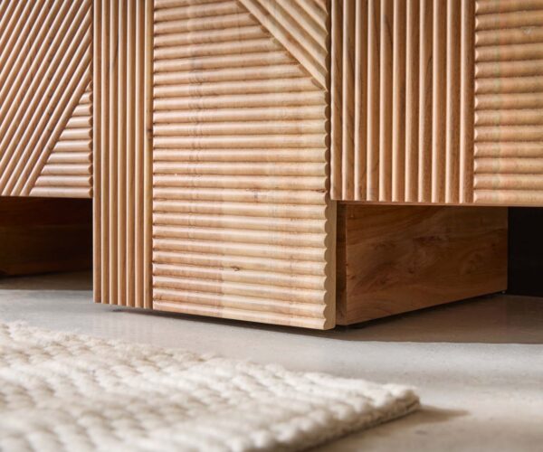 A Naxxar komód nem csak megjelenésében lenyűgöző, hanem használatában is praktikus: az öt ajtó könnyedén nyitható és zárható, mögöttük polcos rekeszek találhatók, amelyek helyet biztosítanak a mindennapi tárgyak számára. Az előlap grafikus kialakítása jelentősen megkülönbözteti a komódot a hagyományos bútoroktól, és minden helyiségben a figyelem középpontjába helyezi. A masszív akácfa hosszú élettartamot garantál, és élénk fa szerkezetével egy darabka természetet hoz otthonodba. A Naxxarral olyan komódot választasz, amely egyszerre kínál stílusos megjelenést és átgondolt funkcionalitást.