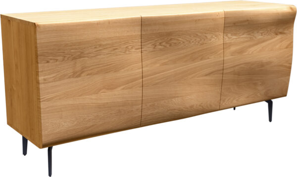 A New Live-Edge sorozatú komód természetes és egyben elegáns karaktert kölcsönöz a lakóterednek. Az egyedi előlapjai finom természetes élzárással készülnek gondos kézműves munkával, és tökéletesen harmonizálnak a nemes tölgyfa egyedi erezetével. Három ajtó mögött rengeteg tárolóhely rejtőzik, amely segít otthonodat rendezetté és stílusossá varázsolni.