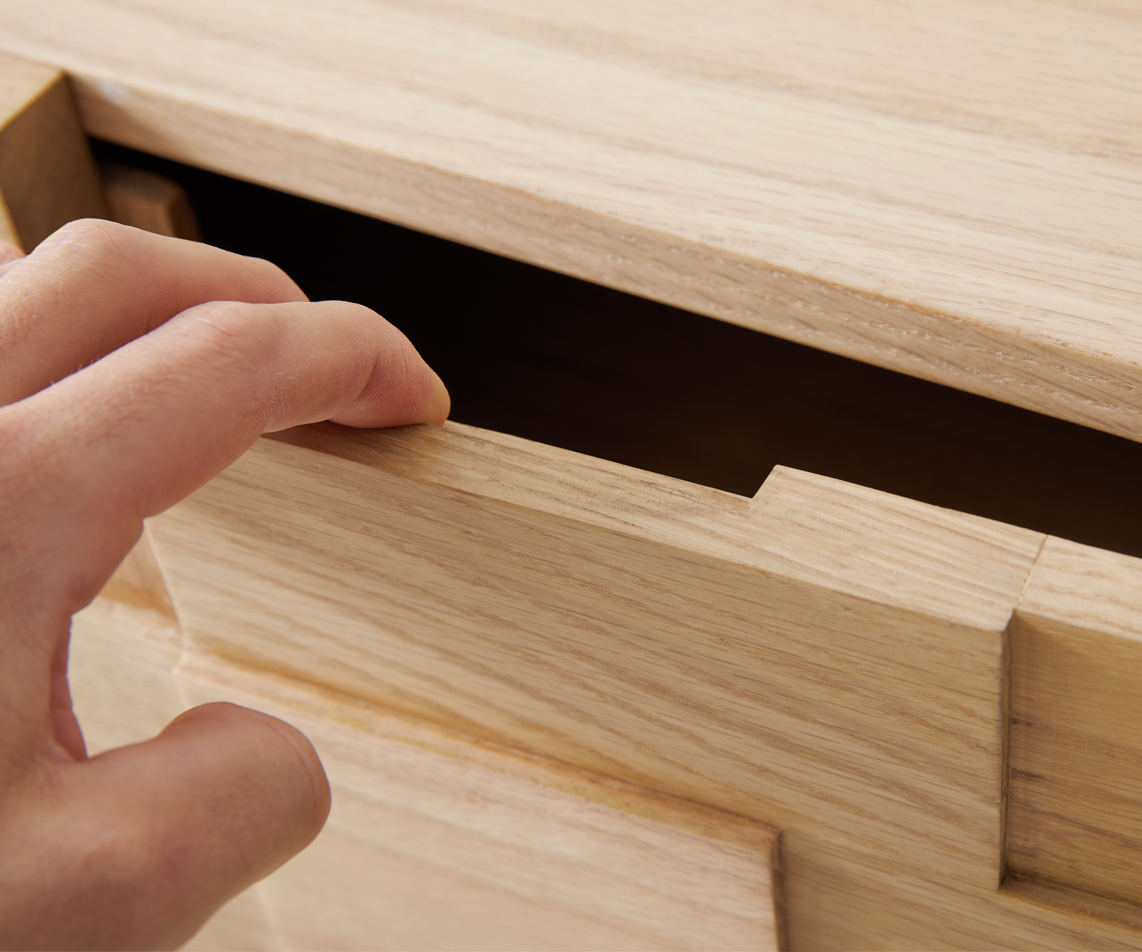 Elbűvölően szép és minden tekintetben egyedi – így mutatkozik be a Puzzle komód, amely fenntartható erdőgazdálkodásból származó, finoman erezett tölgyfából készült. Míg a korpusz filigrán és visszafogott kialakítású, az előlap egyedülálló 3D-designjával, egy kidolgozott puzzle mintával kápráztat el. Ennek elkészítéséhez az egyes faelemeket gondosan válogatják, majd kézzel, függőlegesen és vízszintesen egy hangsúlyos, összhangzó mintázattá állítják össze, amelyet MDF hordozóra rögzítenek. A lenyűgöző mélységet és térhatást a különböző anyagvastagságú téglalapok és négyzetek alkalmazása biztosítja, így minden Puzzle komód lélegzetelállító, egyedi darabbá válik.