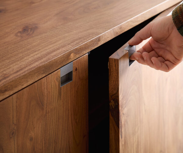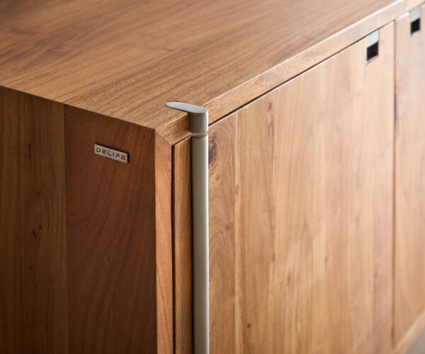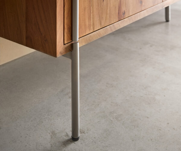 A Rivoro 210 cm szélességben magabiztos jelenlétet és természetes erőt sugároz. Masszív akácfa, látható erezetével és kiváló minőségű lakkozással melegséget és karaktert visz a térbe. Az ezüst színű, karcsú, kerek fém lábak hűvös, ipari hangulatot kölcsönöznek. Az előlapba süllyesztett fogantyúvájatok kiemelik a tiszta vonalvezetést, és különösen nyugodt, prémium hatást keltenek.