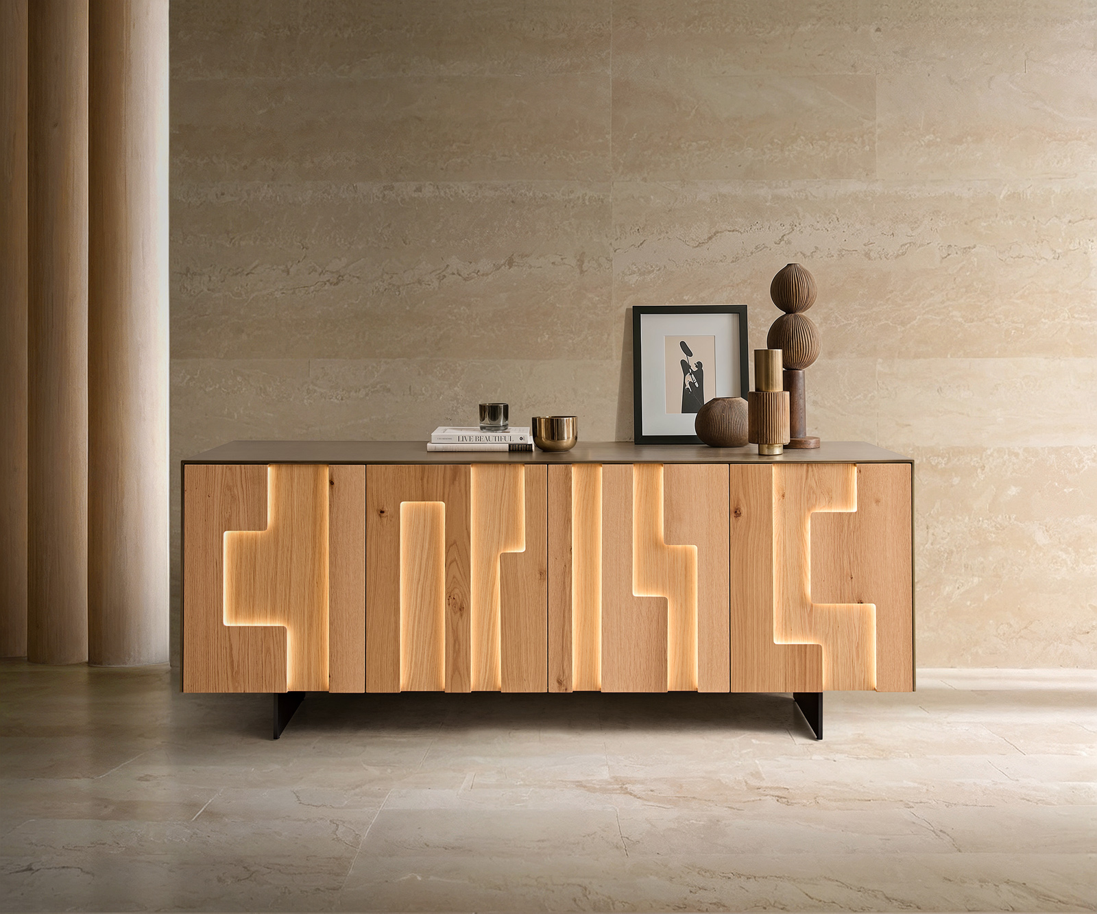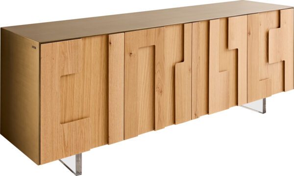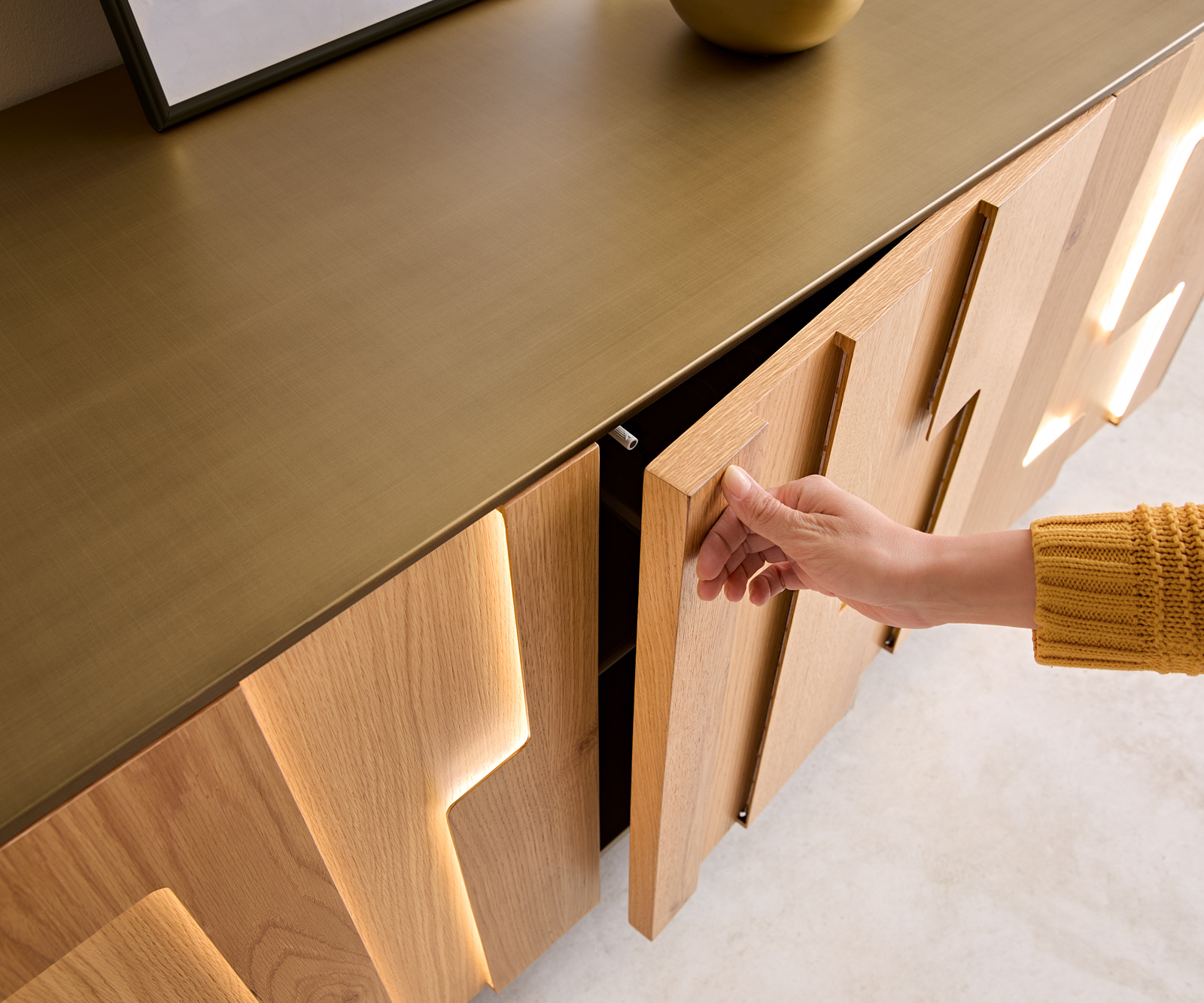Oldalt és a rakodófelületen a Taka a tiszta eleganciára épít: a felületek nemes, szálcsiszolt metál arany színű lakkal vannak bevonva, amely luxus keretet ad a bútornak, különleges mélységet és értékességet kölcsönözve neki. Ez a természetes és fémes felületek keveréke lenyűgöző megjelenést és magas minőségű karaktert eredményez. A Taka több mint egy komód – kifejező lakberendezési tárgy, amely harmonikusan ötvözi a design-t és a funkciót.