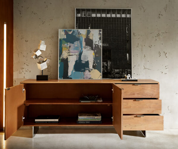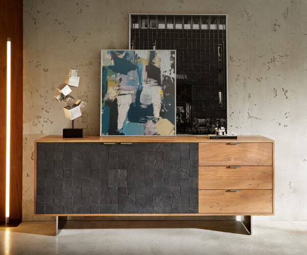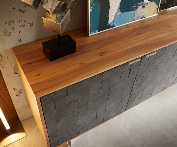 A Teele kollekcióból származó elegáns komód designjának középpontjában a válogatott masszív fa és a mozaikkő kombinációja áll. Az eltérő felületi struktúrákat a természetes anyagok kontrasztos, kifejező színei emelik ki hangsúlyosan. A rozsdamentes acélból készült fogantyúk és lábak fényes akcentusokat adnak, és modern módon egészítik ki az ízléses dizájnt.