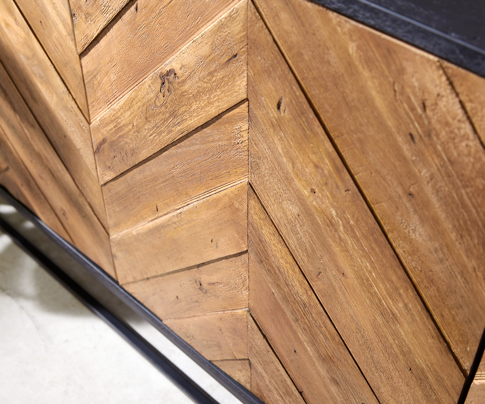 • Dvířka Flambé se vzorem rybí kosti dodávají příborníku rustikální vzhled.
