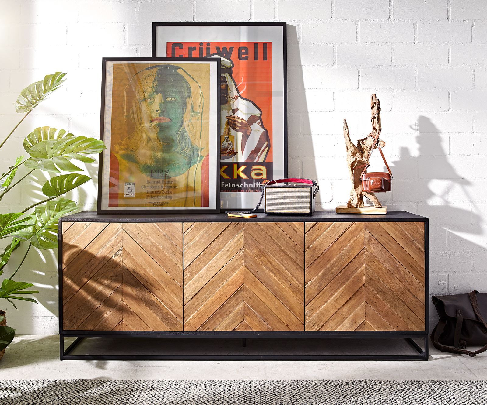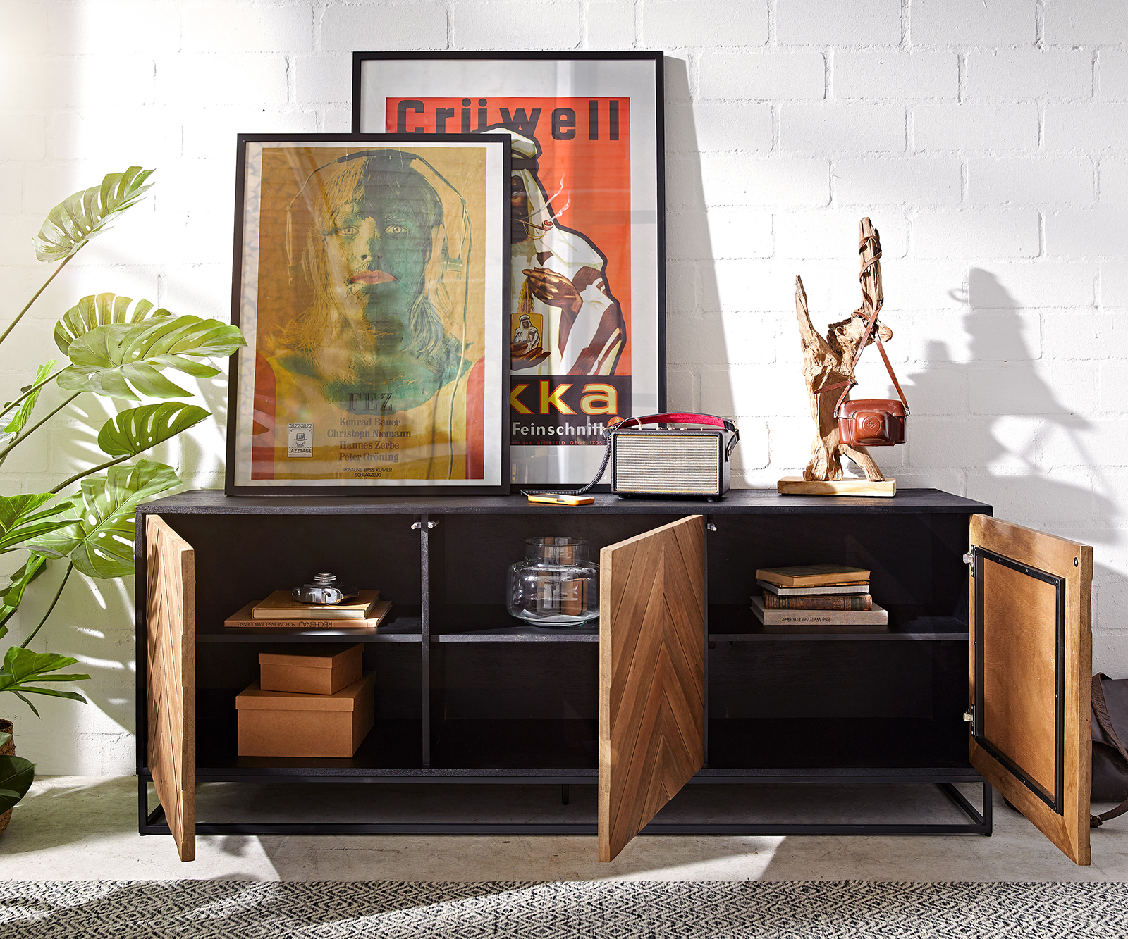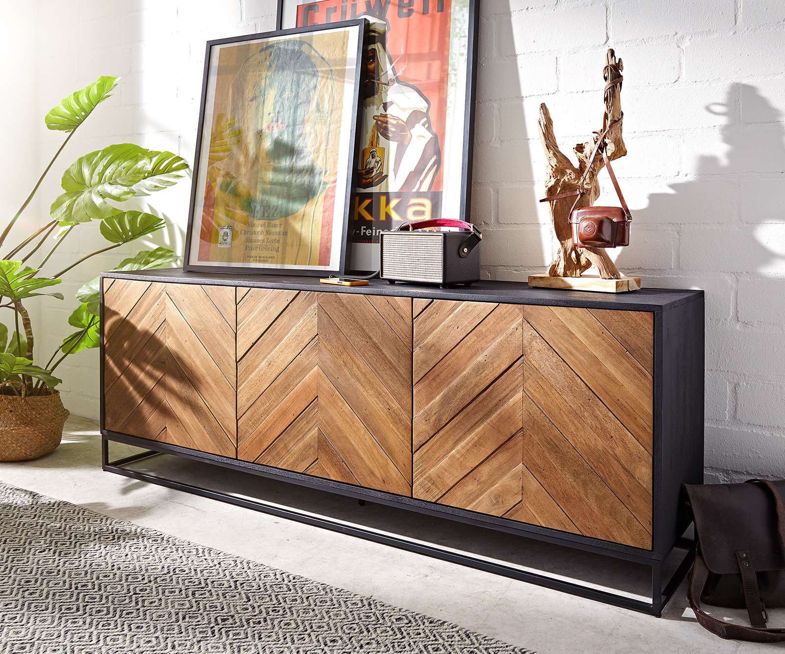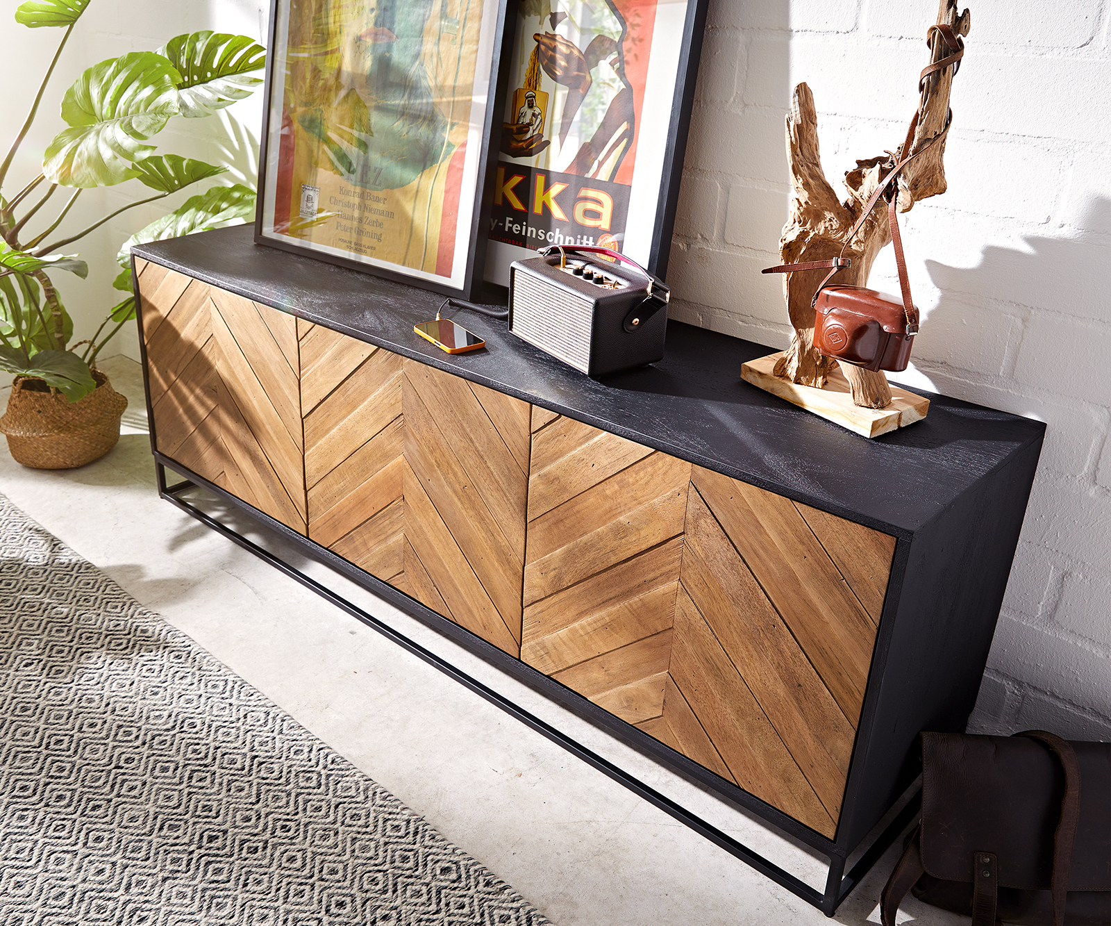 Velkorysý, impozantní a přirozeně okouzlující příborník Famke se hodí do mnoha různých stylů interiéru. Korpus komody, vytvořený z obzvláště udržitelného mangového dřeva, byl zabalen do klasické černé barvy. To zvýrazňuje flambovaná čela v ušlechtilém teakovém vzhledu a s propracovaným vzorem rybí kosti a zajišťuje harmonický celkový vzhled. Příborník stojí na pevném, ale filigránském rámu z práškově lakovaného černého kovu. Lehká konstrukce zajišťuje vizuální beztížnost a zároveň dokonalou stabilitu.