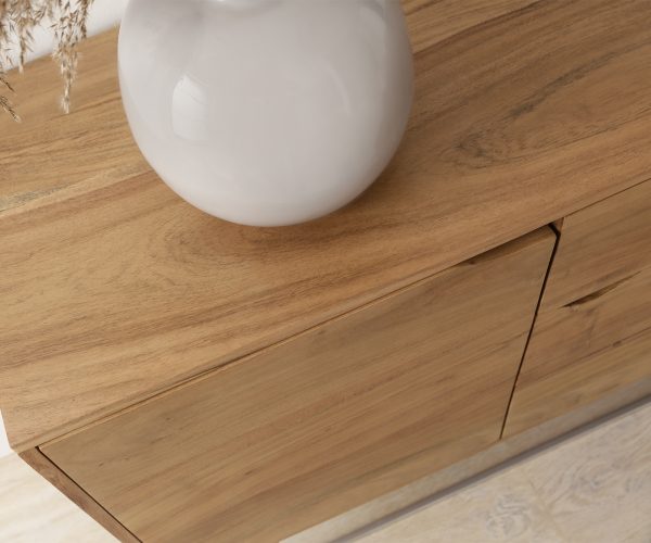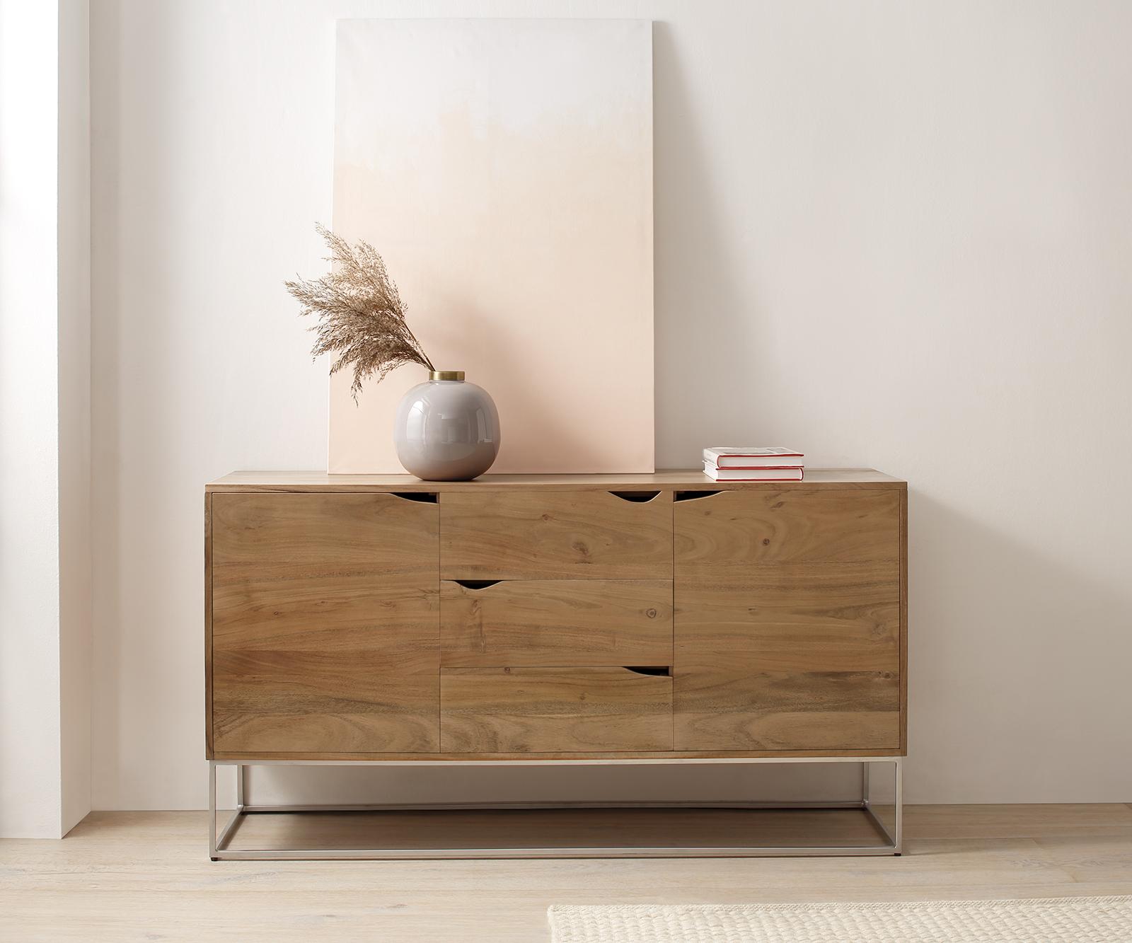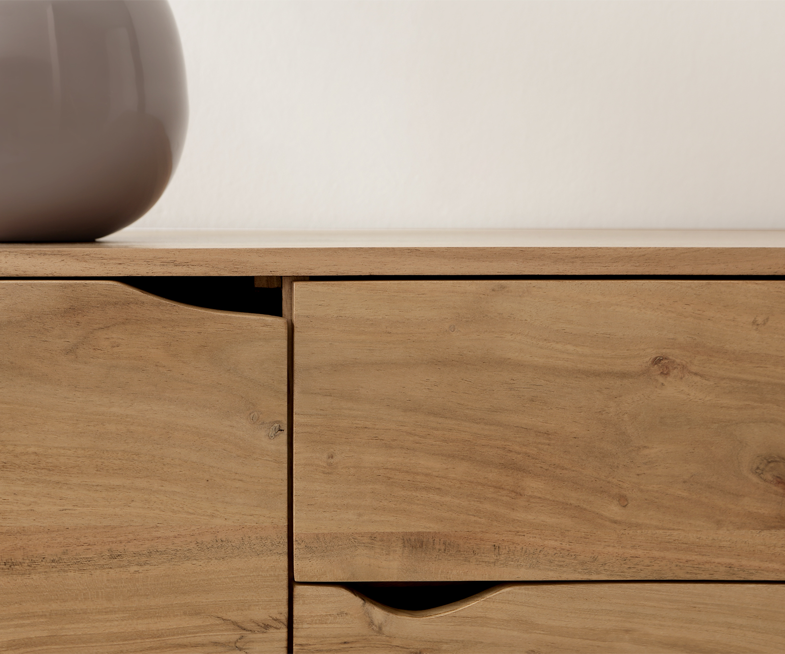 S tímto důrazně jednoduchým, ale rafinovaným příborníkem se fascinující krása cenného přírodního dřeva ukazuje z nápadně elegantní stránky. Díky své teplé a světlé barvě vytváří masivní akáciové dřevo útulnou obytnou atmosféru. Jeho kresba, která se vyznačuje nejjemnějšími liniemi a vlnkami, je u každého kusu individuální. Výřezy určené jako úchytky pro otevírání prostorných úložných prostor a zásuvek umožňují, aby pestrá kresba dřeva získala vizuální převahu a zároveň se stala rafinovaným středobodem pozornosti.