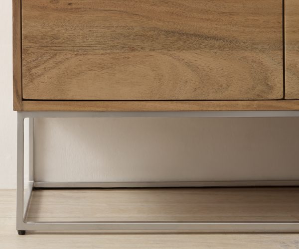 Díky zpracování nesmírně robustního a necitlivého akátového dřeva je tato komoda kusem nábytku, který odolá všem nástrahám každodenního života. Mimořádně jemné opěrné nohy z lesklého stříbrného kovu dodávají tomuto elegantnímu nábytkovému prvku moderní a elegantní vzhled.