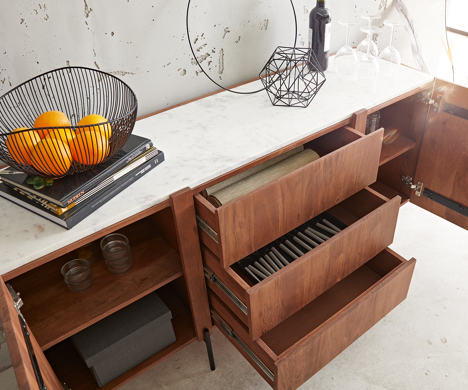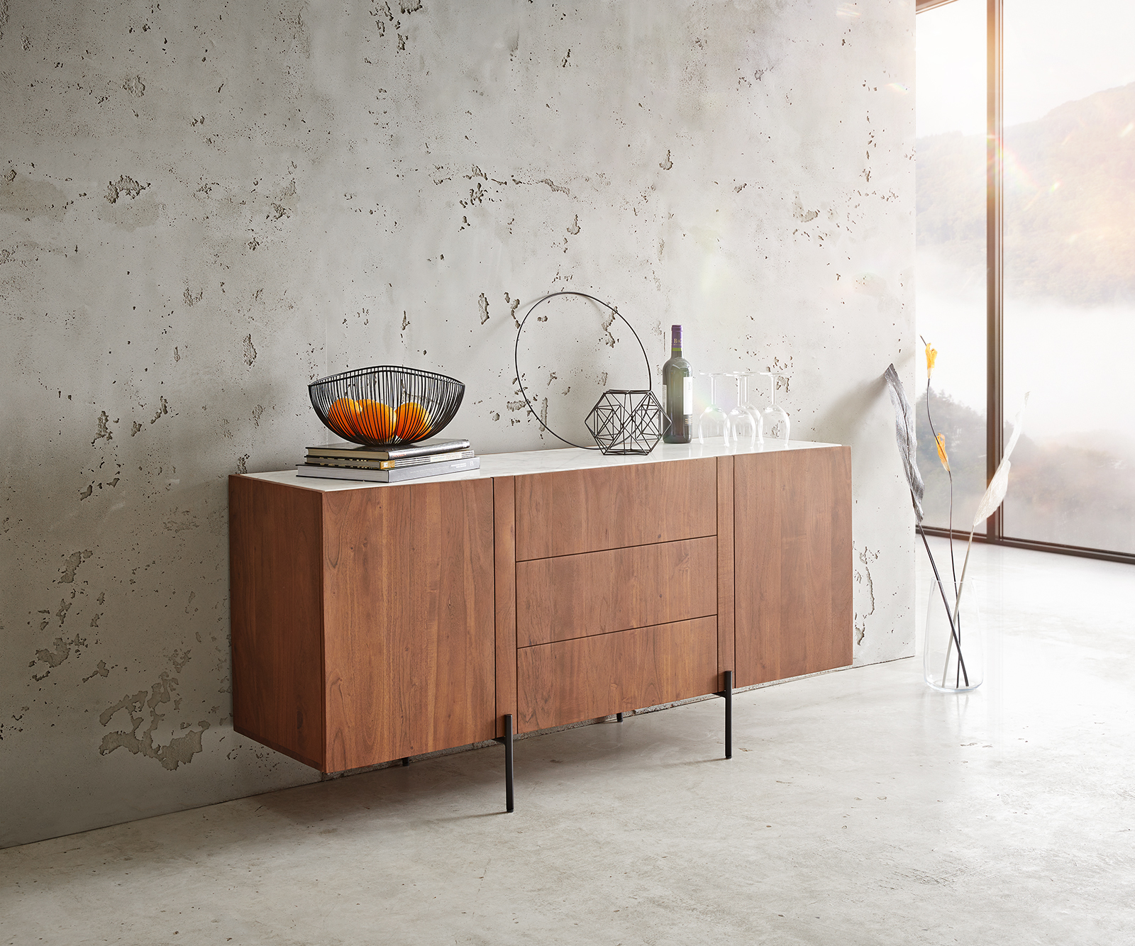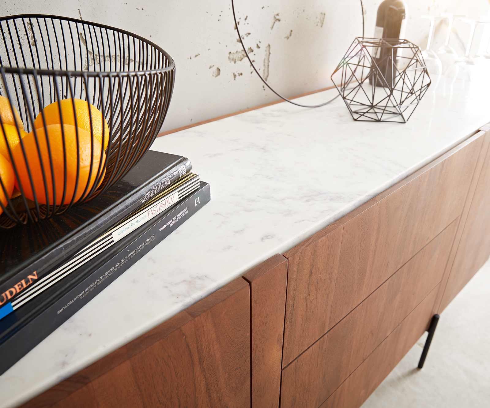 Díky svým kompaktním rozměrům propůjčuje tento model i menším místnostem eleganci vyznačující se čistou přirozeností. Robustní akát a odolný mramor z něj činí oblíbeného společníka na nespočet let. Praktické rozdělení pomocí zásuvek a přihrádek zajistí bezpečné uložení všech věcí potřebných v každodenním životě.