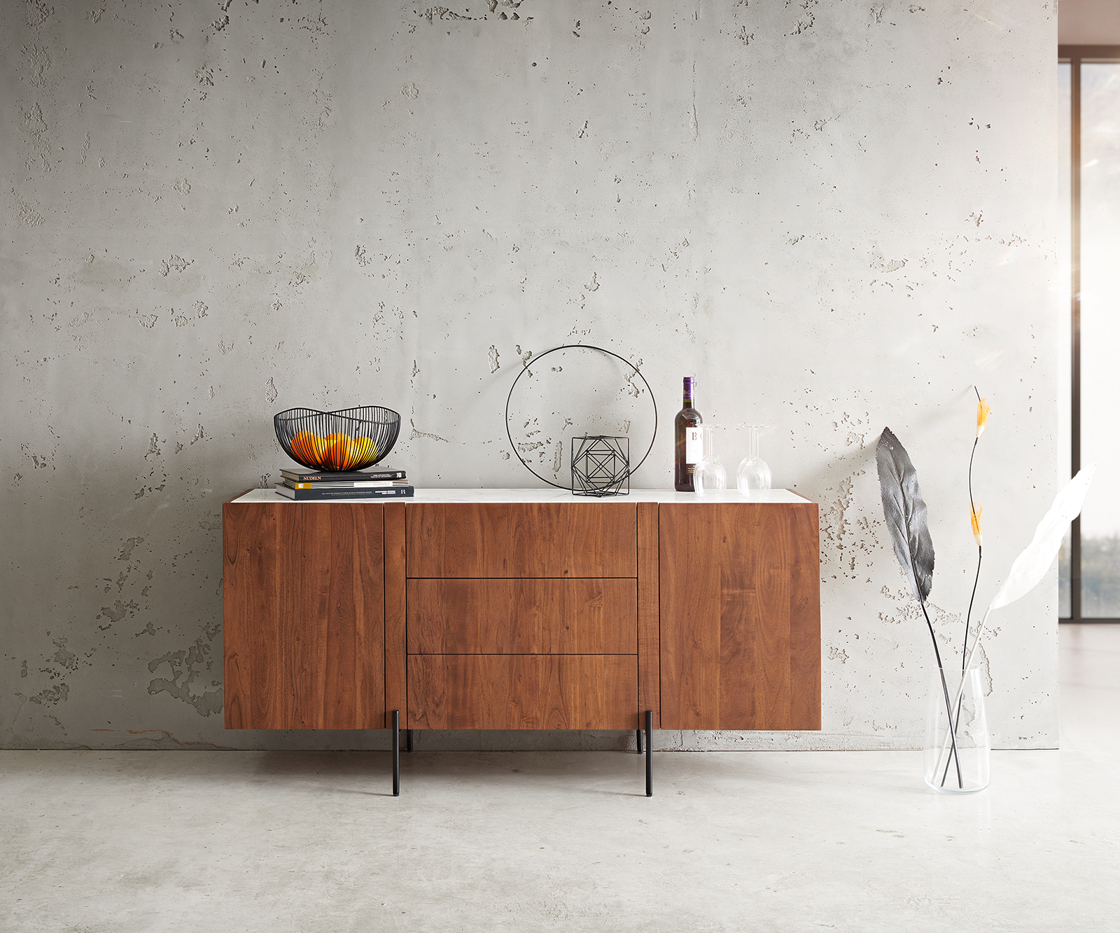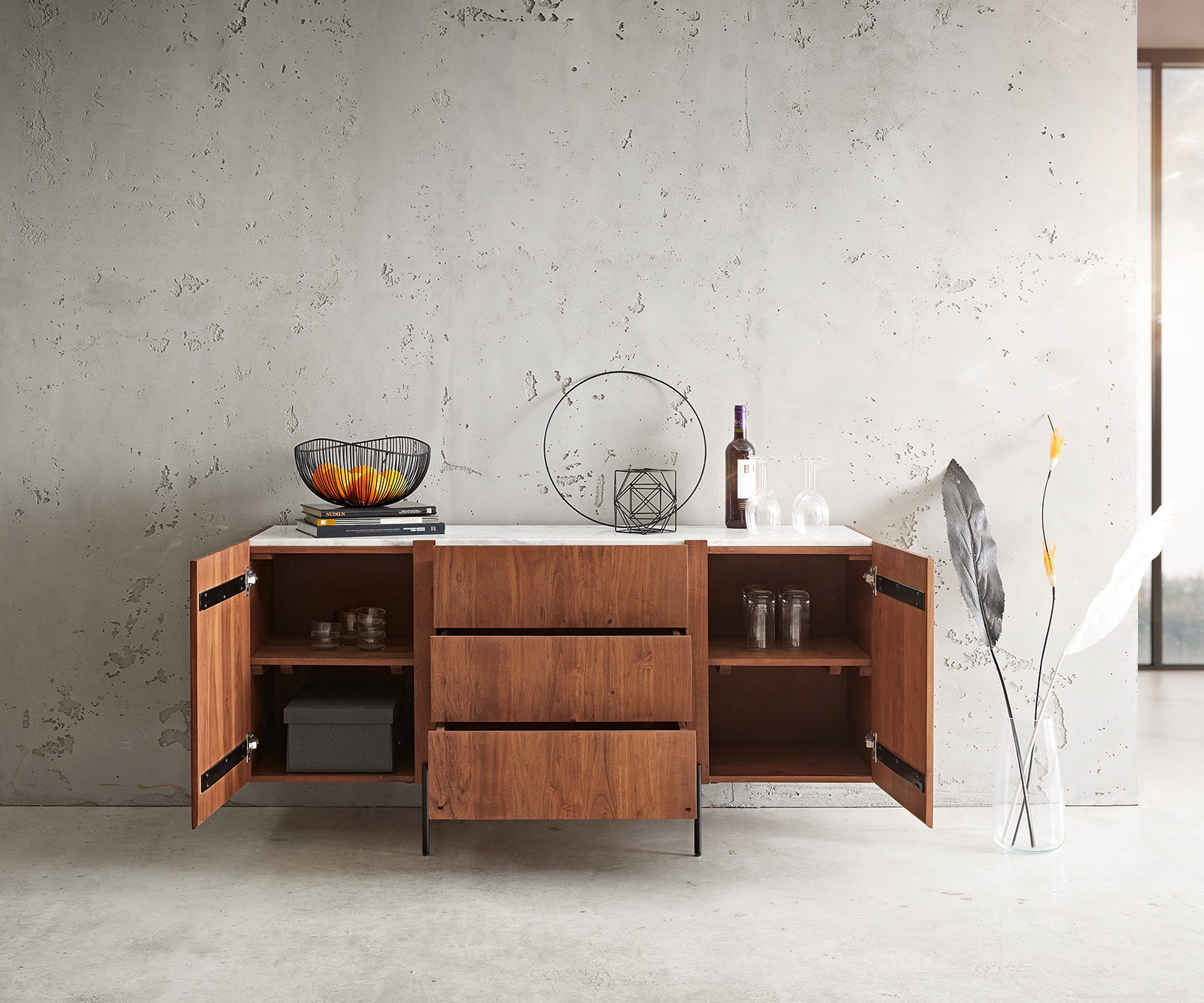 Pečlivé zpracování vybraných přírodních surovin dělá z příborníku Secara kus nábytku, který vám bude dělat radost po dlouhou dobu. Akáciové dřevo v tmavě hnědé barvě v kombinaci s krásou bílého mramoru vytváří působivý celkový obraz. Záměrně sladěná struktura dřeva a kamene dodává tomuto modelu působivou eleganci. Černé opěrné nožky dotvářejí důrazně jednoduchý, a přesto nápadně živý design tohoto znamenitého zařizovacího předmětu.