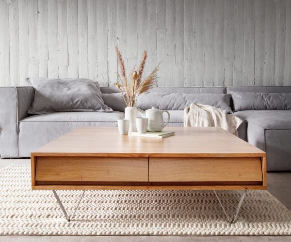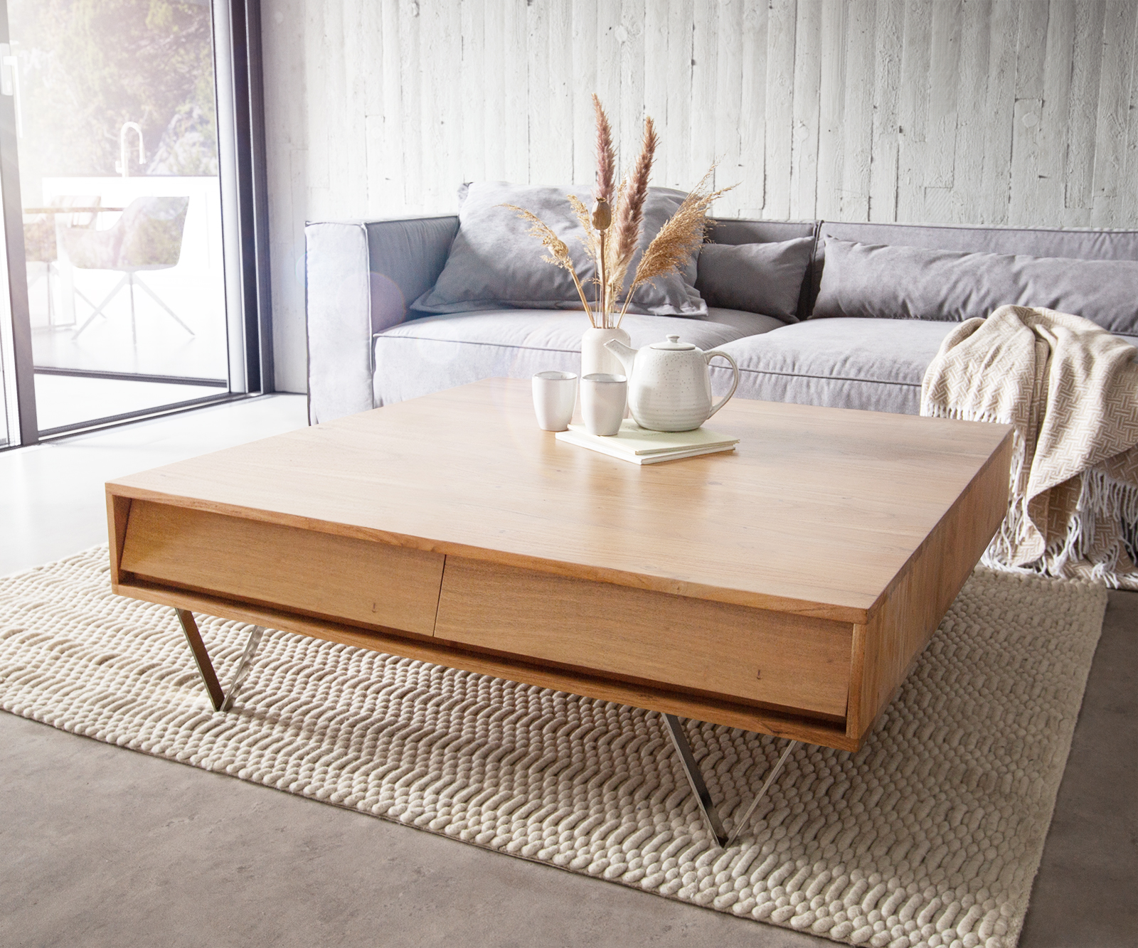 V přírodní barvě se projevuje jemné zrno akácie. Čtyři zásuvky ukrývají cenný úložný prostor v čtvercovém stole.