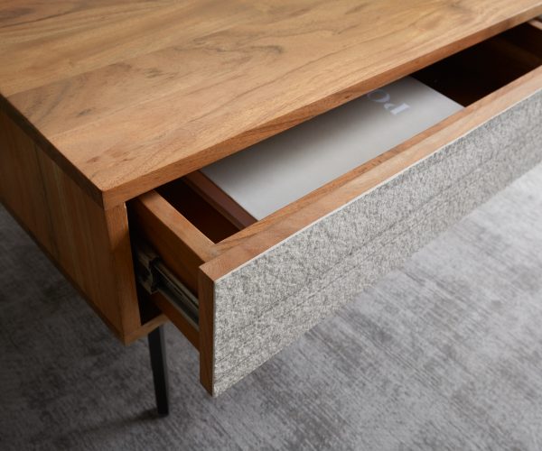 Tělo konferenčního stolku je vyrobeno z vynikajícího masivního dřeva. Přírodní akácie zaujme svými teplými barevnými odstíny a jedinečnou kresbou. Integrované praktické zásuvky zdobí pravý kámen v harmonické barvě. Podnož z MDF desky je opatřena povrchovou úpravou „edge banding”, která zajišťuje masivní dřevo na všech viditelných hranách.