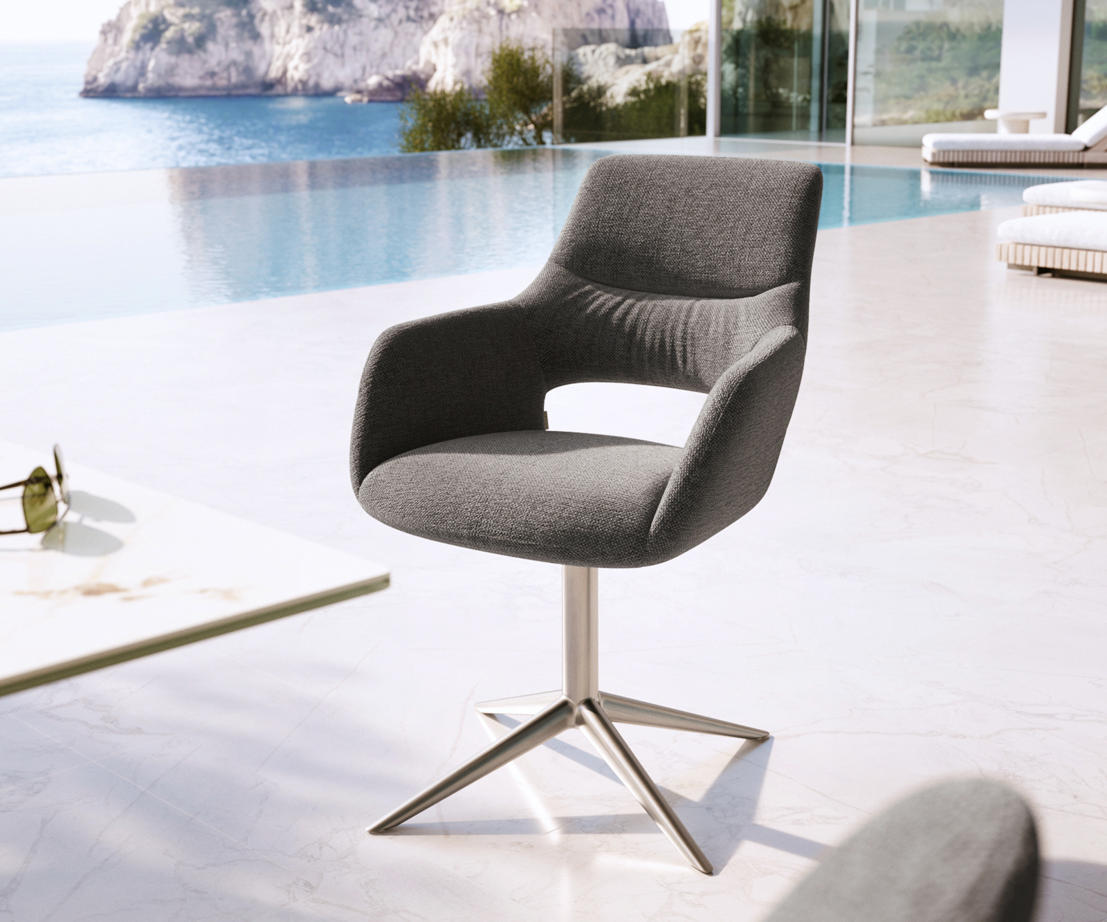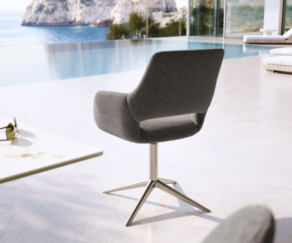 Kültéri étkezőszék Yago-Flex karfás strukturált szövet grafit rozsdamentes acél kereszt láb 360°-ban forgatható billenő funkcióval