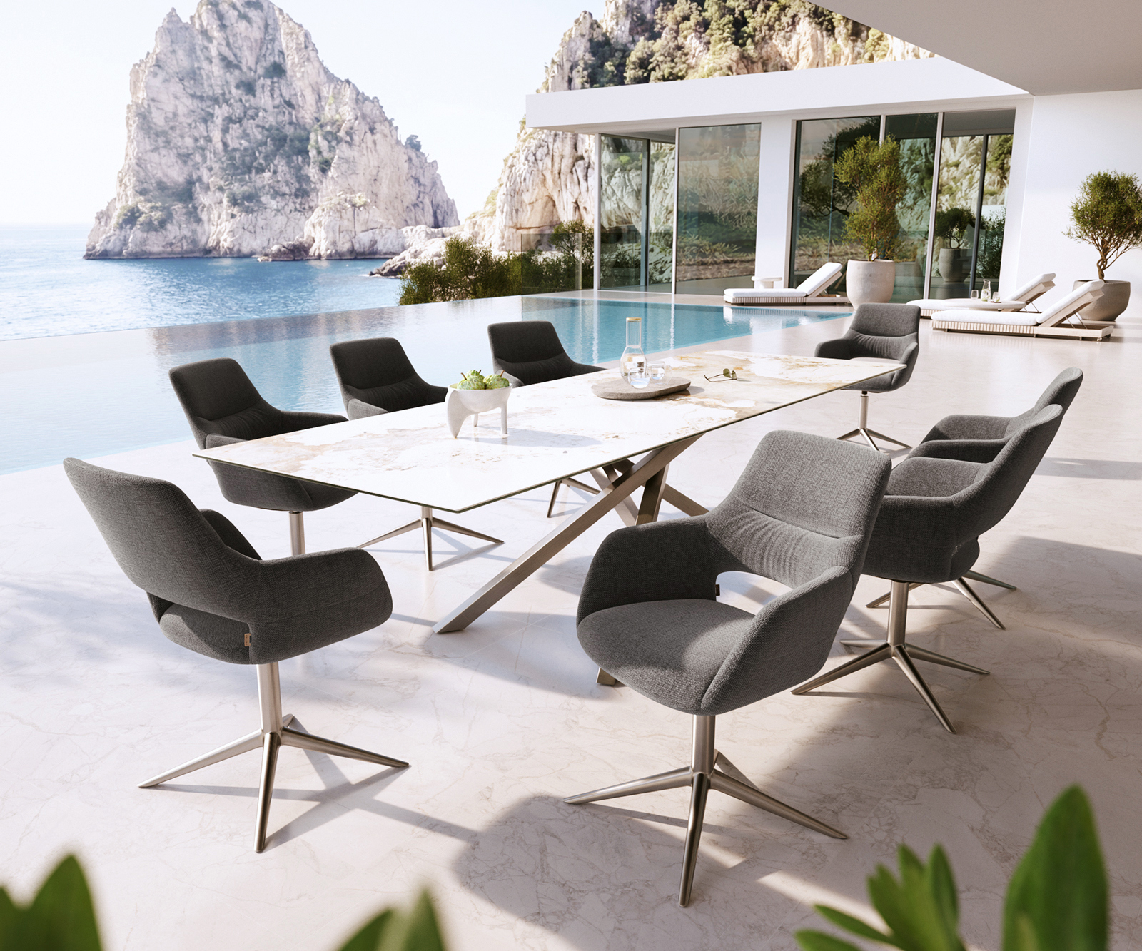 A Yago-Flex az otthonos érzést viszi ki a szabadba. Áttört háttámlával, finoman ívelt karfákkal és elegáns díszvarrással könnyed, elegáns és csodálatosan otthonos hatást kelt. A vízáteresztő komforthab támogatja a kültéri használatot, így stílusos választás teraszra, erkélyre és beltérbe egyaránt. Így jön létre egy kültéri étkezőszék, amely bármilyen környezetben kivételesen harmonikusan mutat.