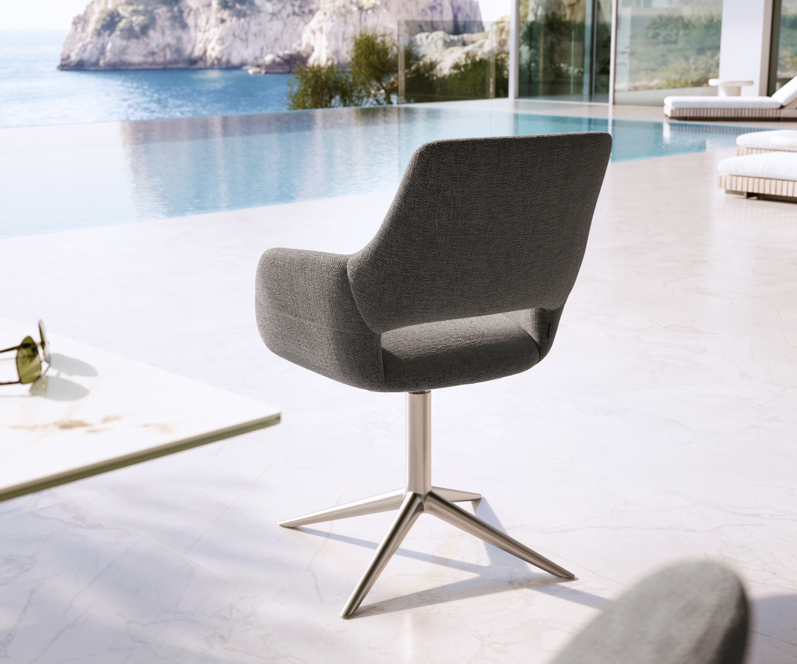A kézzel csiszolt rozsdamentes acélból készült láb nyugodt, prémium eleganciát sugároz. A finoman megmunkált felület nemes fényt kölcsönöz neki, miközben különösen ellenállóvá teszi a rozsdával és időjárással szemben – ideális stílusos kültéri terekhez.