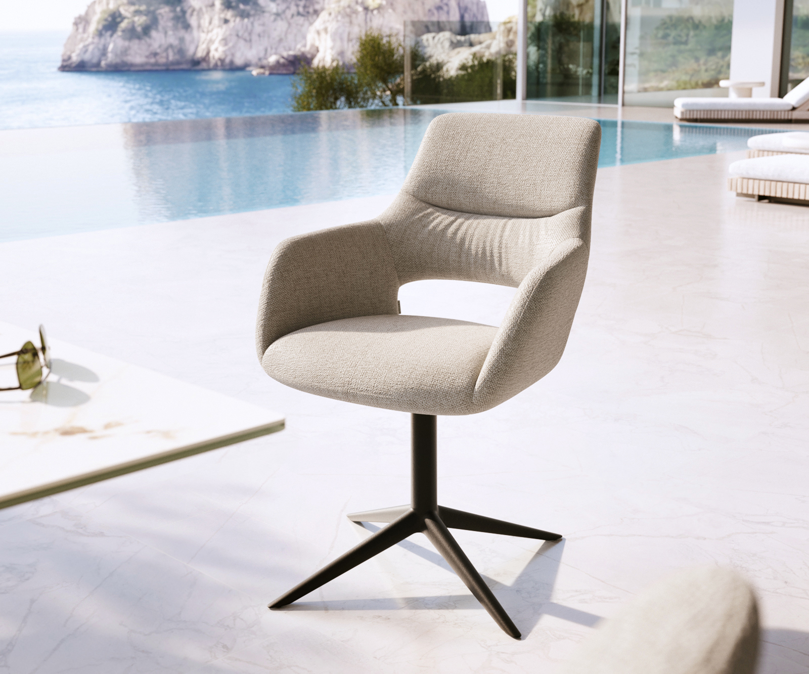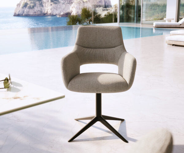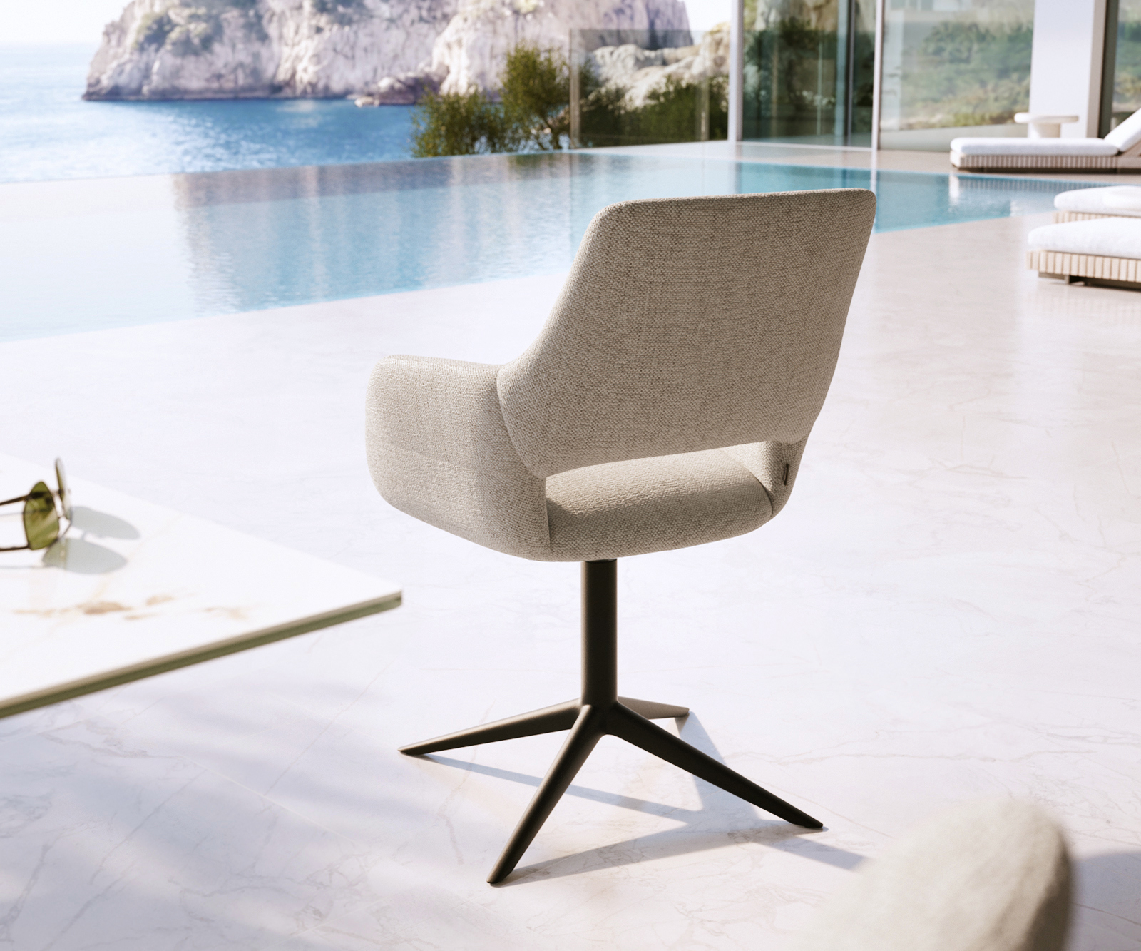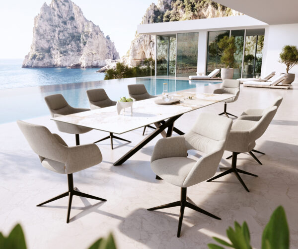 A Yago-Flex a beltéri otthonosság érzetét viszi ki a szabadba. Áttört háttámlájával, finoman ívelt karfáival és apró díszvarrásával könnyed, elegáns és csodálatosan otthonos hatást kelt. A vízáteresztő komforthab támogatja a kültéri használatot, így stílusos választás teraszra, erkélyre és beltéri térbe egyaránt. Így születik meg egy kültéri étkezőszék, amely bármilyen környezetben különösen harmonikusan hat.
