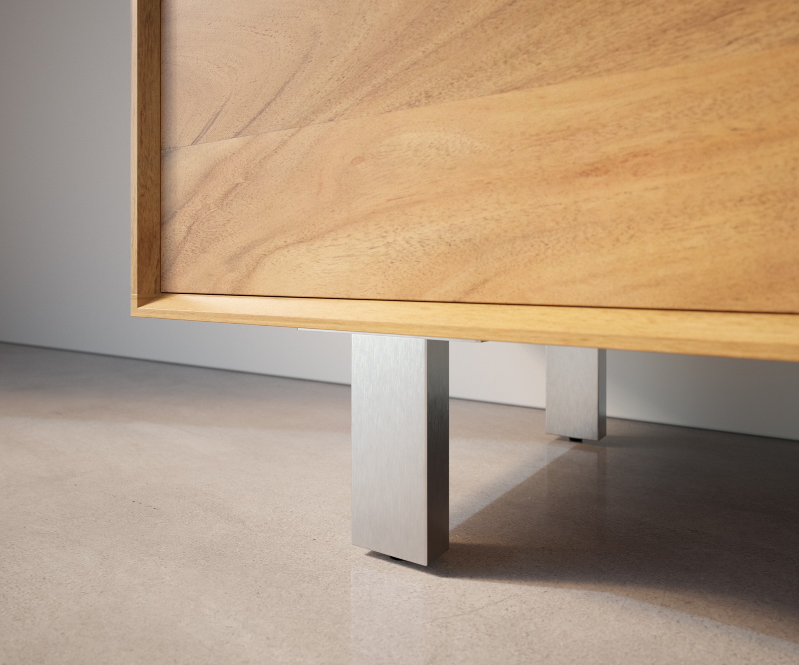 A lábak kézzel csiszolt rozsdamentes acélból készültek. Egy bonyolult csiszolási és kefélési eljárás eredményeként viszonylag érdes felület jön létre, sok apró polírozási nyommal. Ezek hihetetlenül szép fényt adnak, és megvédik az anyagot a rozsdásodástól és a kopástól.