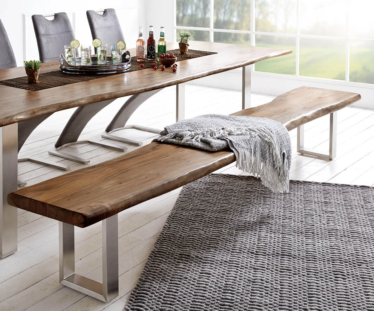 Lavice Live-Edge, vyrobená z ušlechtilých materiálů, přesvědčí vynikajícím zpracováním všech detailů. Dřevěná lavice vyrobená z jemného akátu s přírodní hranou stromu dotváří atmosféru interiéru jako robustní a atraktivní prvek. Tvrdé dřevo vykazuje vzrušivě živou kresbu obohacenou o typické nepravidelnosti v matném hnědém odstínu. Lavice z masivního dřeva působí přitažlivě moderním dojmem díky svému rovnému rámu z odolné nerezové oceli.
