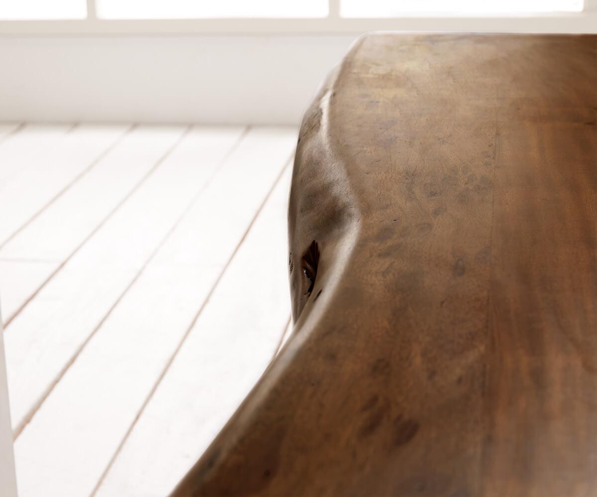 Každá dřevěná lavička ze série Live-Edge je jedinečná, protože je na ní jedinečně patrná kresba, hrana stromu a další detaily z přírody. Nádherná lavička s hranou stromu proto upoutá pozornost ve všech prostorách domova. Jako lavice do jídelny skvěle doplňuje stůl ze stromu akácie.