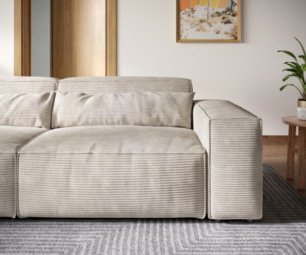 A gyönyörű világos bézs kordbársony anyag különösen hívogató megjelenést kölcsönöz a Sirpionak. A különleges ülési komfortot a puha párnázat és a kimagasló minőségű rugózás biztosítja. Számos laza párna és elegánsan széles karfa teszi ezt az egyedülálló design darabot otthonod kényelmes és páratlanul szép központi elemévé.