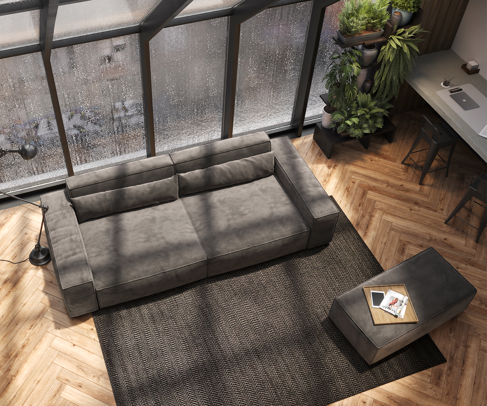 Ez az elegáns kárpitos bútor padlótól padlóig készült, és geometrikus megjelenésével minden tekintetet magára vonz. A markáns vonalvezetés hatásos kiemelése érdekében a Big-Sofa kidolgozott szegélyvarrással készült a kontúrok mentén. Az extravagáns bútor valódi hátoldallal rendelkezik, így lakásod közepén is stílusosan helyezhető el.