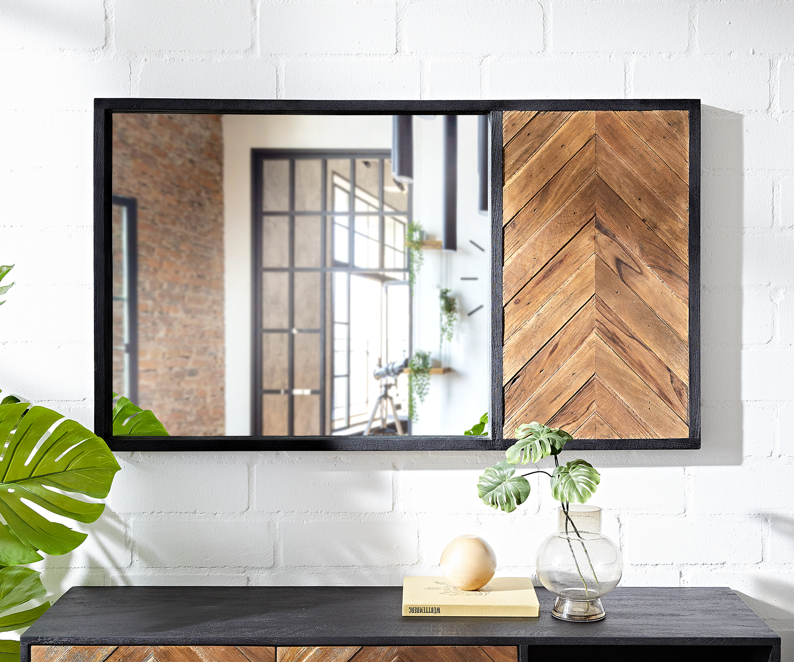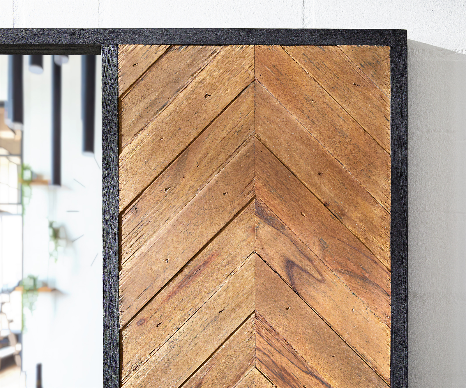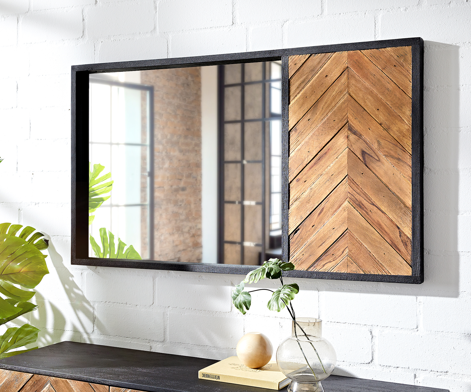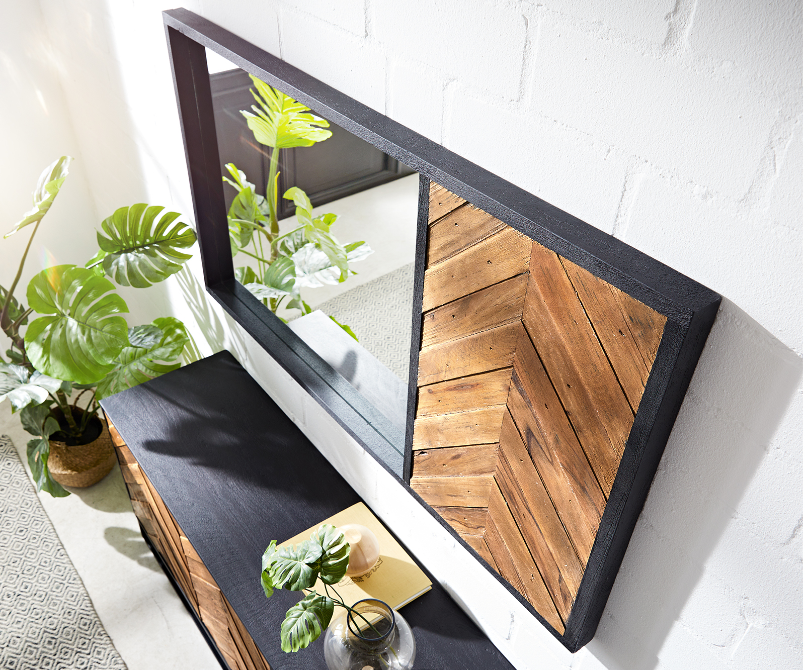 Zrcadlo Famke zaujme složitě zpracovanou a flambovanou boční stěnou v jedinečném vzhledu rybí kosti. Nástěnné zrcadlo s velkou zrcadlovou plochou, uložené v elegantním rámu z masivního mangového dřeva v nadčasové černé barvě, stylově přitahuje všechny pohledy.