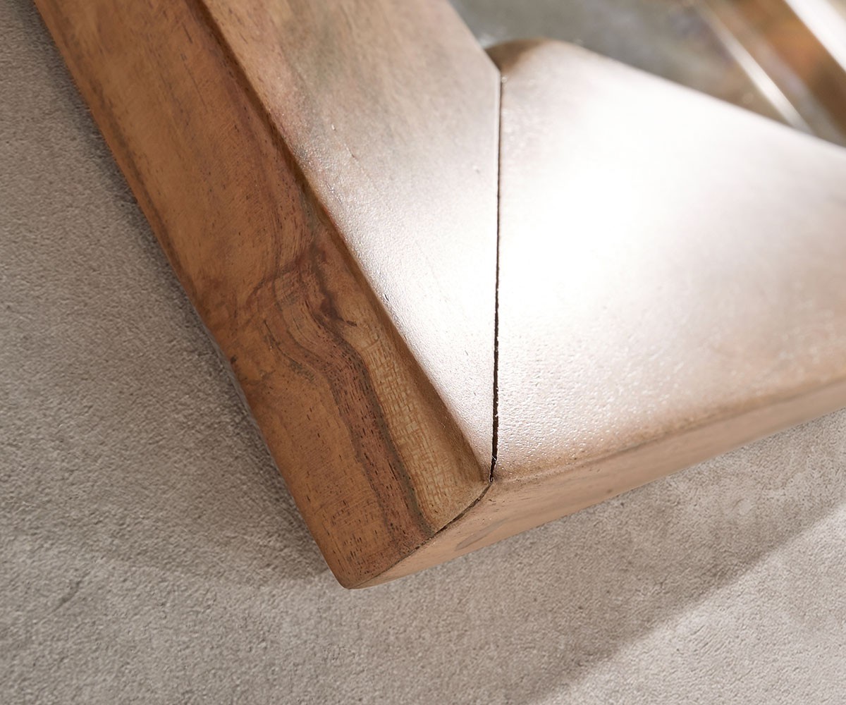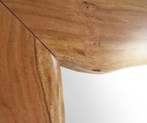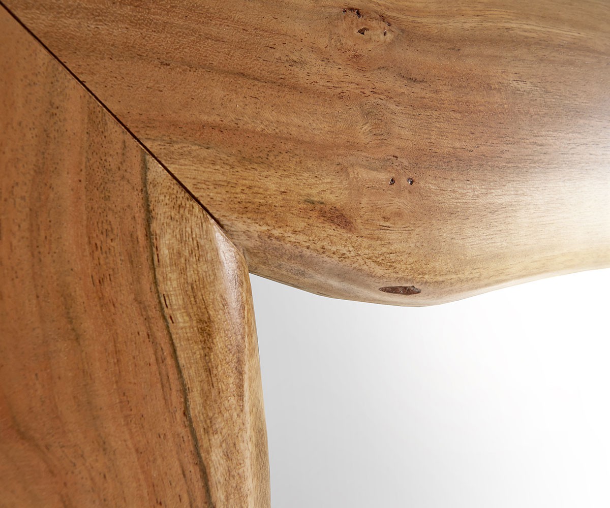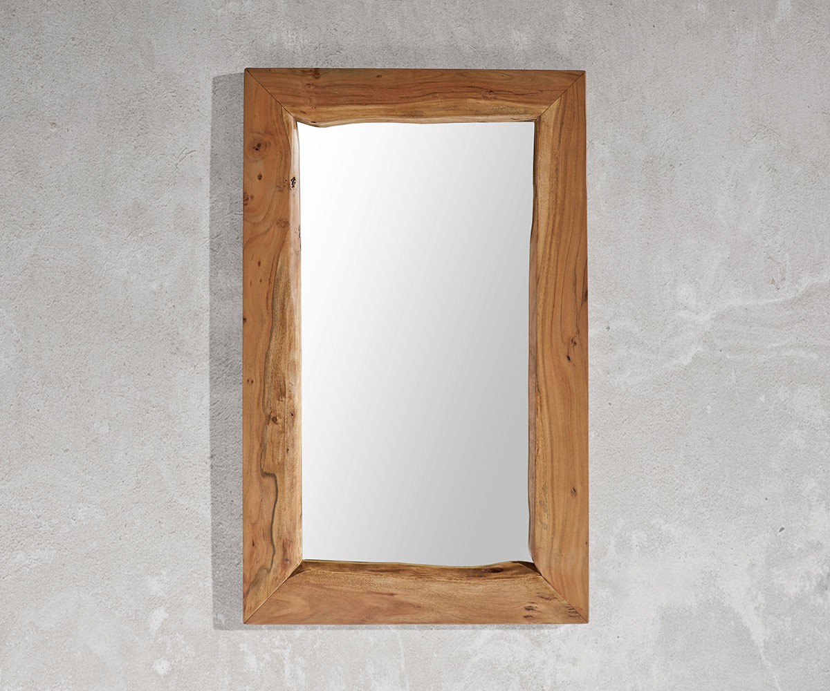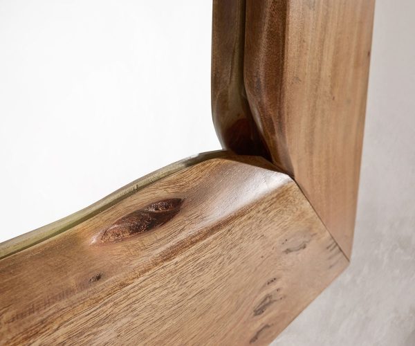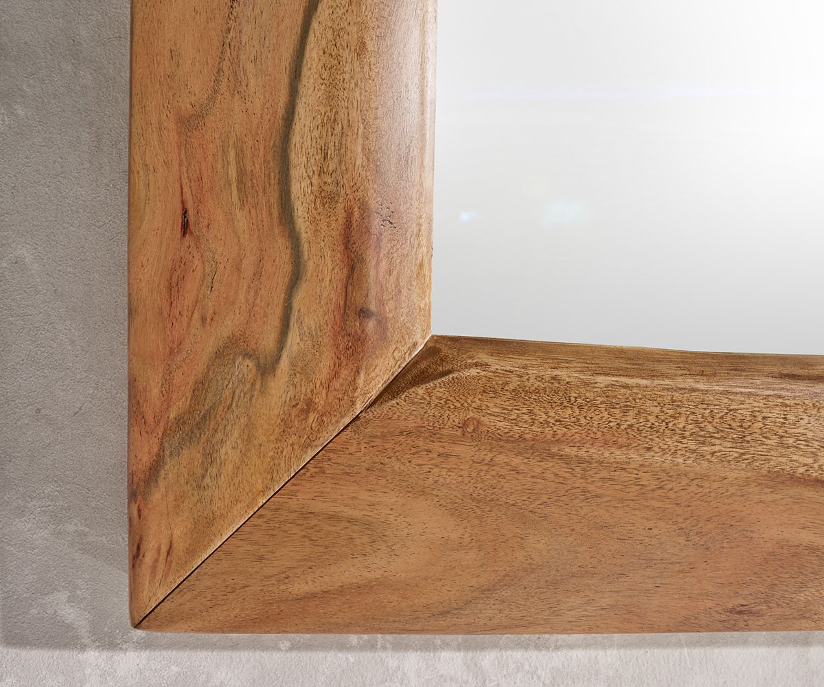 Nástěnné zrcadlo Live-Edge je elegantním doplňkem do moderního interiéru. Krásné šatní zrcadlo usnadňuje každodenní styling, nabízí všestranné využití a efektně zvýrazňuje vzhled stěny za ním. Kreativně navržený rám z masivního akáciového dřeva zajišťuje výjimečný charakter bytového doplňku. Masivní dřevo jako udržitelná surovina vykazuje živou kresbu s nenapodobitelnými vlastnostmi. Inkluze, suky a drobné praskliny nejsou v tomto přírodním materiálu ničím neobvyklým. Nepravidelnosti ve struktuře povrchu rámu činí každé zrcadlo jedinečným.