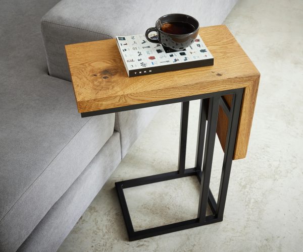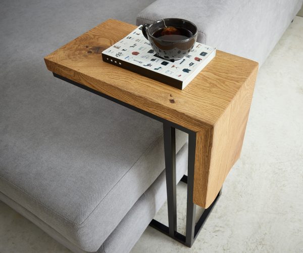 Vizuálním vrcholem designu je kombinace černého kovu a přírodního dubového dřeva. Vynikající kombinace materiálů charakterizuje industriální vzhled tohoto kusu nábytku. Díky kresbě dřeva je každý postranní stolek jedinečný. Další atraktivní kontrast vytváří filigránský rám v kombinaci s masivní hranou dřeva, která byla důmyslně zakomponována do osobitého designu postranního stolku.