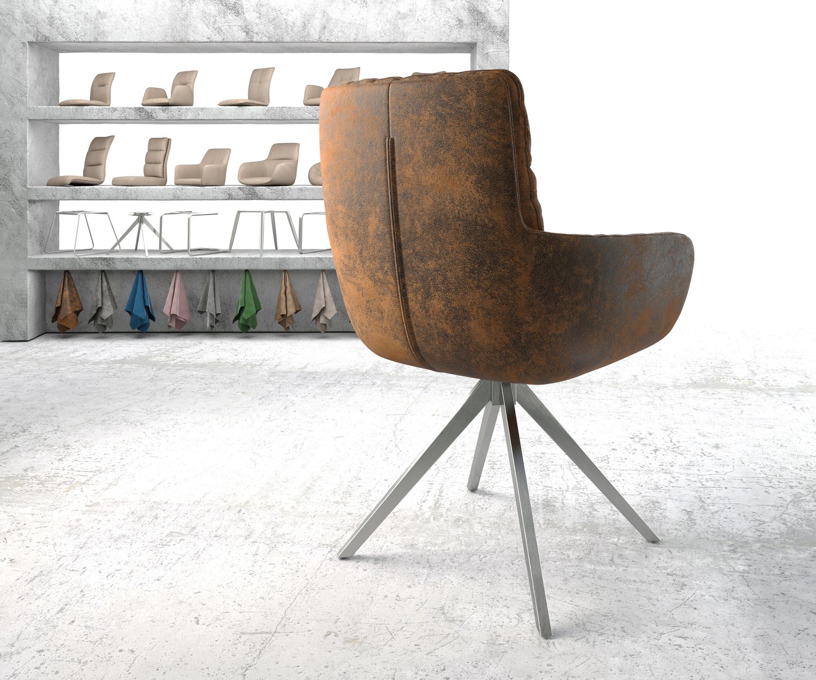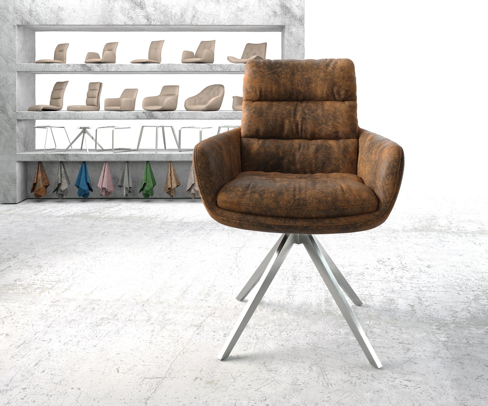Otočná židle Abelia-Flex s područkou hnědá vintage křížová podnož hranatá otočná z nerezové oceli