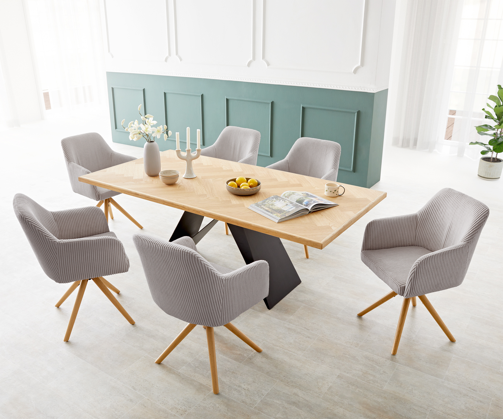 Moderní křížový rám s kulatými nožkami je inspirován módním skandinávským stylem a dodává každé jídelní židli Flex přirozeně harmonický vzhled. Rám lze otočit až o 180 stupňů a má praktickou funkci zpětného chodu.
