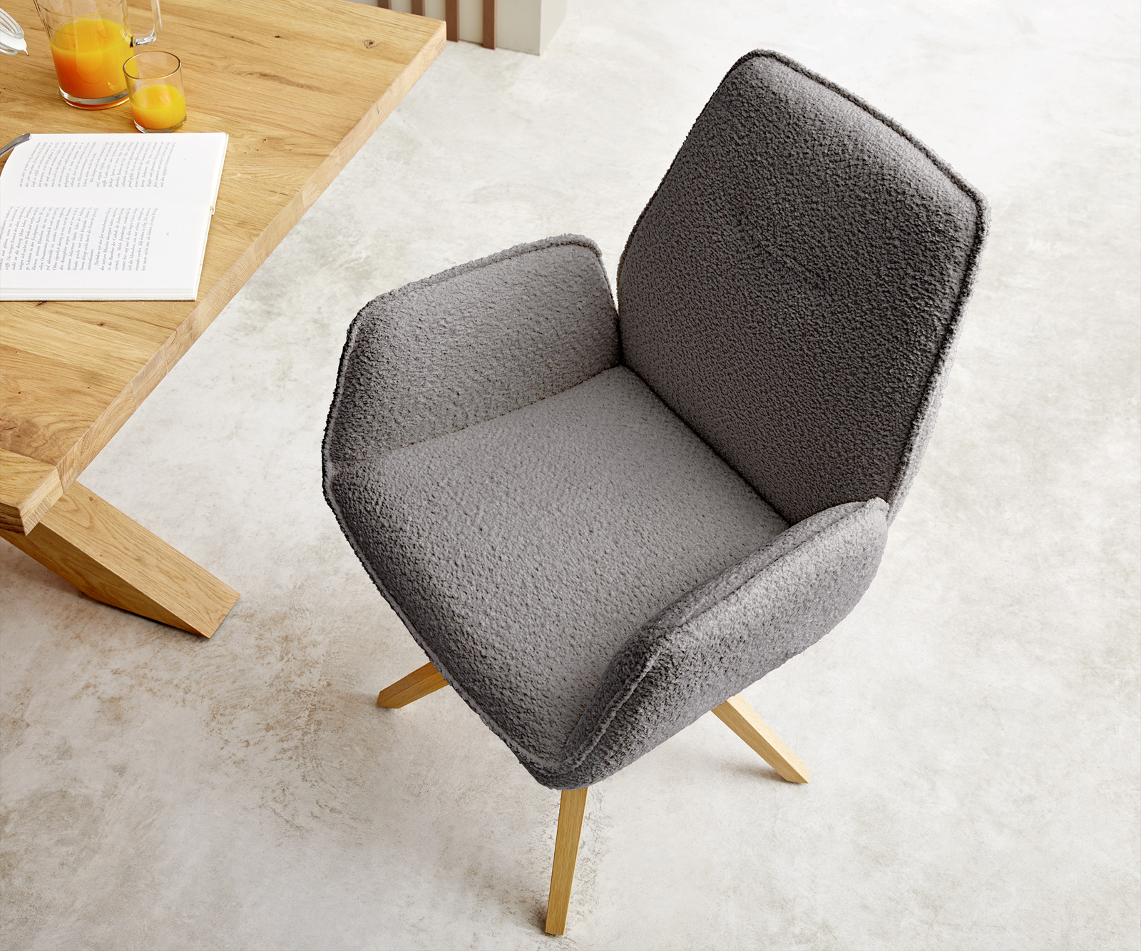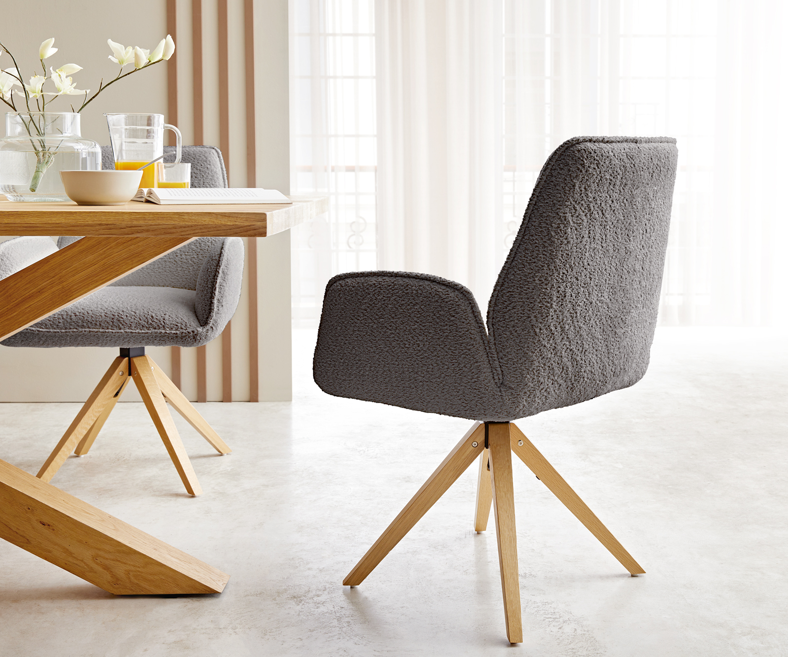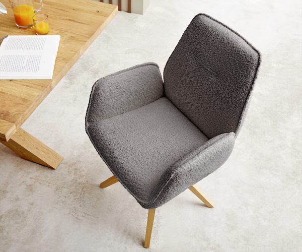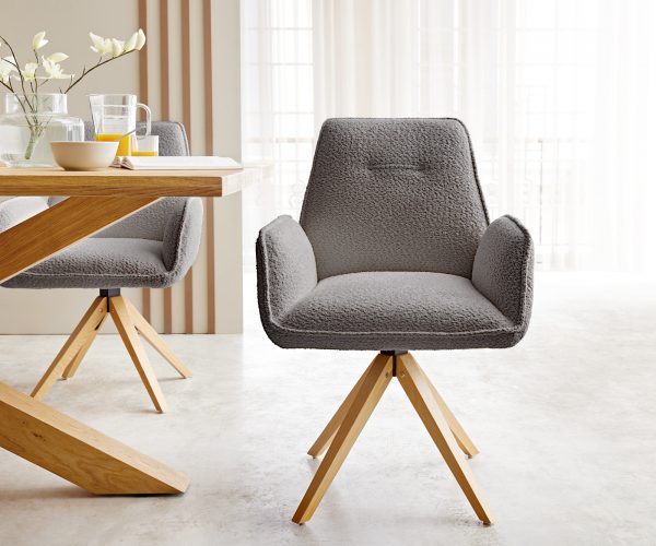 Hodnotná látka bouclé je v elegantním odstínu šedé, který se dobře kombinuje s ostatními barvami v jídelně. Díky své měkkosti na dotek a snadné údržbě je ideálním potahem pro vaše nové jídelní židle.
