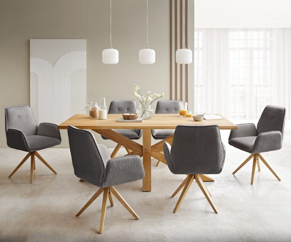 Poutavý křížový rám kombinuje klasický vzhled s přirozenou lehkostí díky čtyřem hranatým nohám. Lze ji otočit až o 180 stupňů a má praktickou funkci zpětného chodu, která vám příjemně usnadní konverzaci u jídelního stolu.