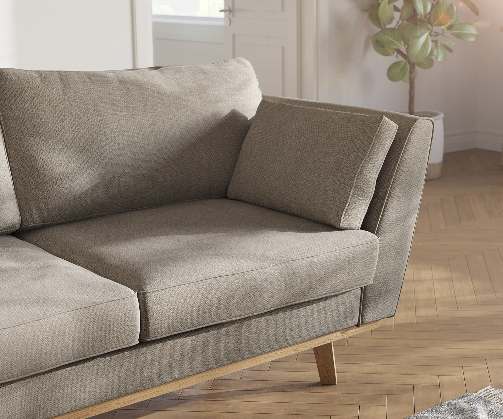 Dřevěné nožky kvalitní 2místné pohovky v barvě buku jsou vyvedeny okolním dřevěným obložením. Tato vkusná kombinace dodává designu důrazně harmonický vzhled. Vysokou míru útulnosti zajišťují mimo jiné područkové polštáře s výplní z měkkého pěnového chmýří, které jsou dokonale sladěné s pohovkou.