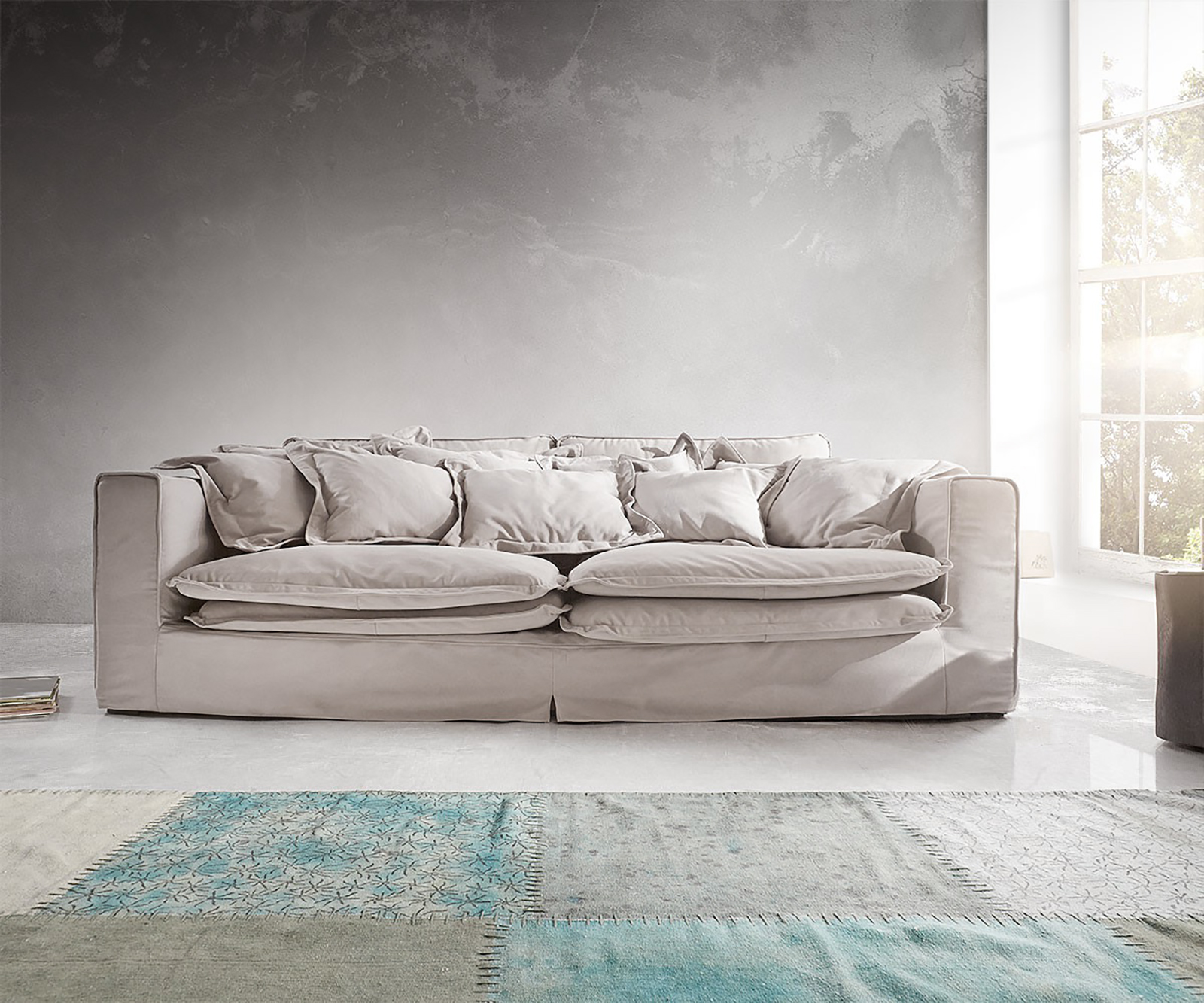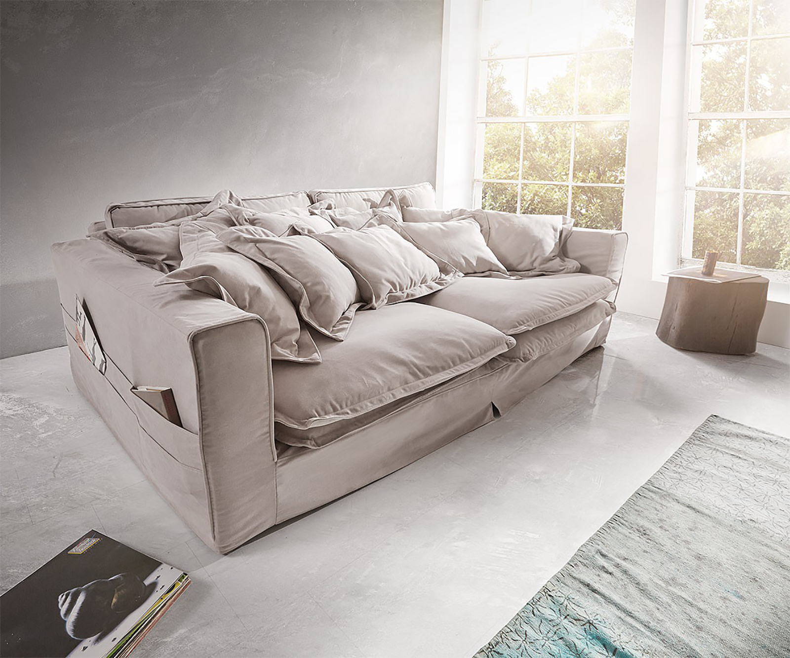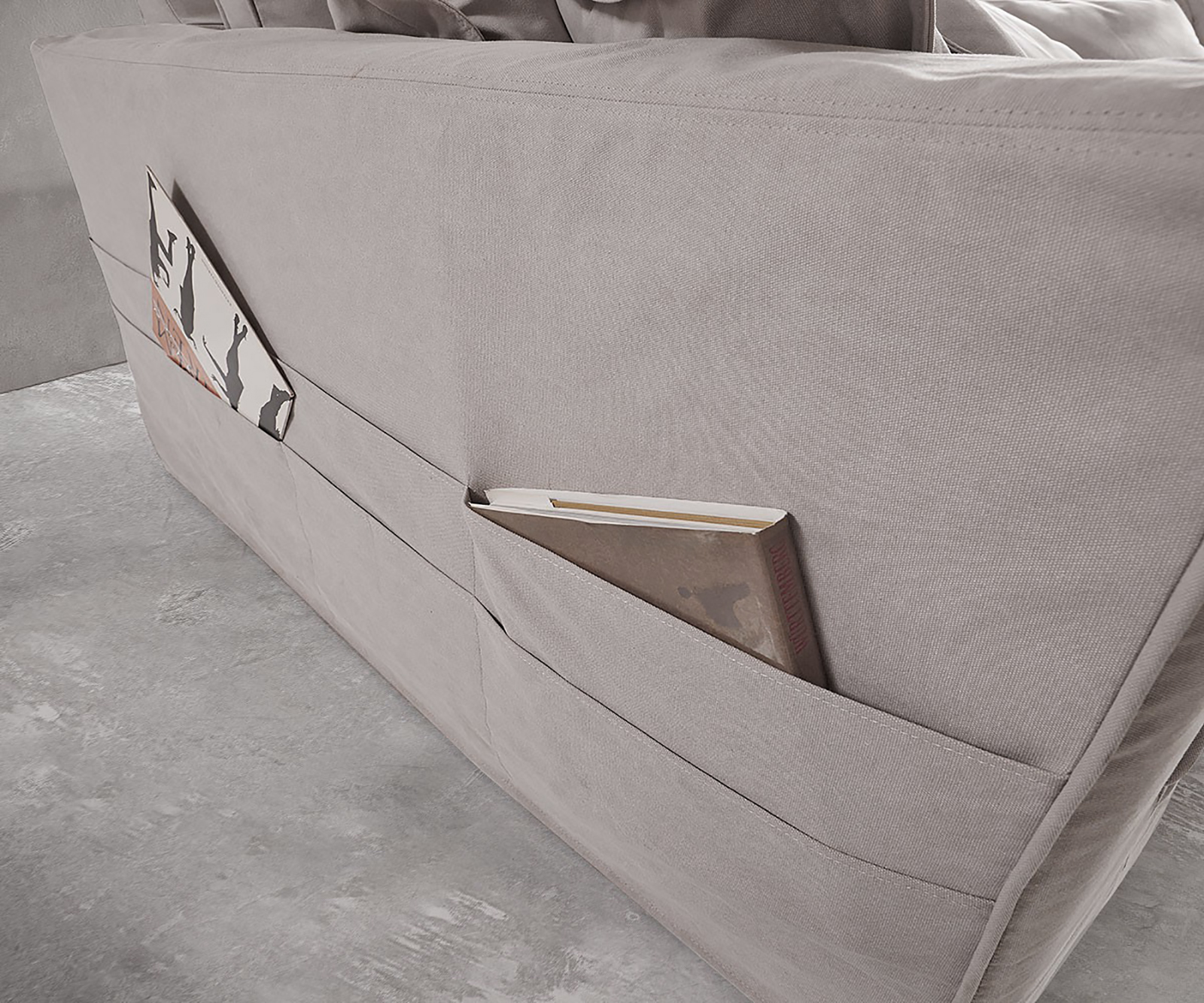 Okouzlující pohovku lze používat vsedě i vleže, k dispozici je mnoho polštářů, které umožňují přizpůsobit jedinečné pohodlí. Potah nejenže chrání před drobnými nehodami, ale poskytuje také boční kapsy na područkách pro časopisy apod. Díky decentnímu světle šedému barevnému provedení lze trojsedák bez problémů kombinovat se světlým i tmavým nábytkem. Pohovka je stejně efektivní v kombinaci s moderním vysokým leskem jako v kombinaci s nostalgicky tvarovaným interiérem z masivního dřeva.