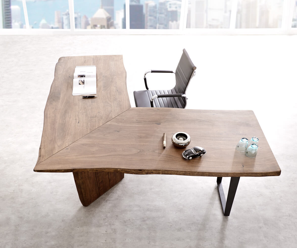 Práce v kanceláři se stále častěji vykonává prostřednictvím internetu, a proto vyžaduje prostor pro počítač. Přesto stále existují procesy, které vyžadují osobní úsilí a tradiční metody. Rohový psací stůl se stromovou hranou vám dává možnost kombinovat obojí na minimálním prostoru. Jednu stranu můžete používat jako počítačový stůl a druhou jako kancelářský stůl pro různé psací úkony.